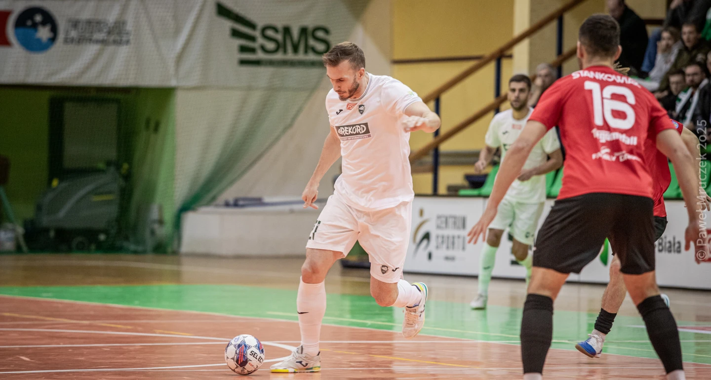 Do rzeczy, po trafieniu w słupek z niewielkiej odległości Franco Spellanzona (3. min.) wydawało się, iż bielszczanie przejęli inicjatywę i mają kontrolę nad meczem. Tymczasem goście w podbramkowym zamieszaniu dali się zaskoczyć pivotowi gospodarzy - Andrzejowi Rutkiewiczowi. Riposta - najlepsza z możliwych, po dwójkowych akcjach Michała Marka (na zdjęciu) z F. Spellanzonem, bielszczanie wyszli na prowadzenie. Fustalowcy Motusa mieli okazję do wyrównania, gdy po strzale Patryka Zająca (10. min.) i interwencji Jakuba Florka odbiła się od słupka. Siedem minut później „aluminium” bramki rywali obił z kolei Kacper Pawlus.