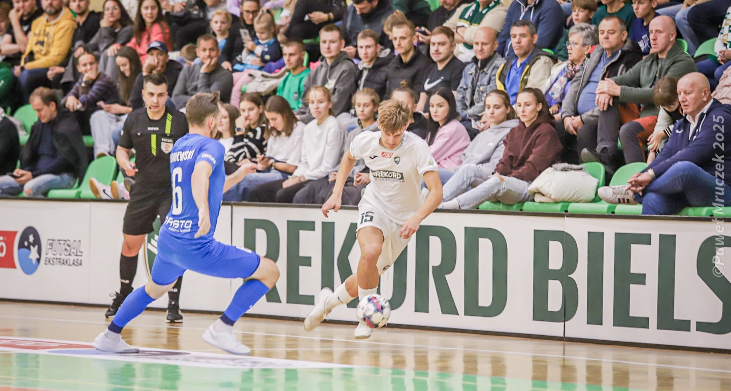 Wiara bielszczan przygasła niedługo po wyjściu obu zespołów na drugą połowę. Zaliczającego dobre zawody w bielskiej bramce J. Florka zaskoczył strzałem z ostrego kąta Gabriel Rinaldin. Od tego kluczowego momentu goście umiejętnie neutralizowali ofensywne poczynania „rekordzistów”. Nawet gdy przyjezdni zawodzili w defensywie, popełniali błąd w obronie, ratował ich z tarapatów świetnie dysponowany w bramce Gutta. Bielszczanom pozostało szukać okazji przy tzw. stałych fragmentach lub w indywidualnych rozwiązaniach. Takich pojedynków, jak ten na górnym zdjęciu, Grzegorza Haraburdy z P. Kaniewskim, było bez liku, a przecież futsal jest grą zespołową…