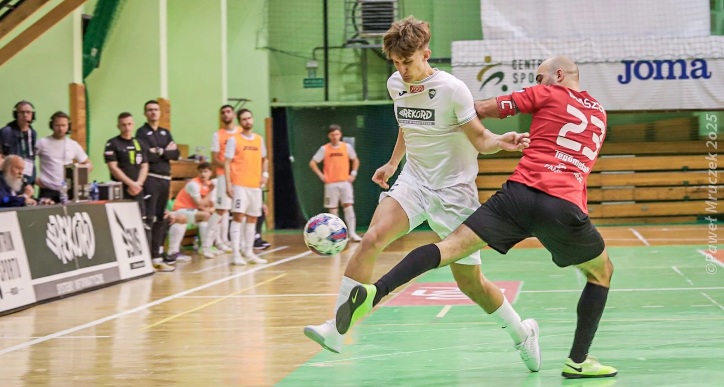 Nie od startu, nie od razu, ale z upływem minut pierwszej połowy zaskakująco dobrze dysponowane „Czerwone Smoki”, grając dynamicznie i agresywnie, zawłaszczały boiskowe terytorium. Goście skutecznie wykorzystywali dziwną niemoc „rekordzistów”, zwłaszcza problemy z dokładnością i wzajemnym zrozumieniu w szeregach gospodarzy. Od razu zaznaczmy - „dramatu” w grze biało-zielonych nie było, wszak postacią „numer 1” w szeregach Red Dragons był strzegący bramki Guilherme Gomes. Brazylijczyka wyróżniała również nadzwyczajna ochota do udziału w ofensywnych poczynaniach przyjezdnych. Tyle, że to samo musimy napisać o dyspozycji golkipera Rekordu - Michała Kałuży, demonstrującego iście reprezentacyjną formę. Bramkarz gospodarzy po wielokroć ustrzegł gospodarzy od utraty gola. Najbliżej tego byli Adrian Ramirez (9. min.), marnujący stuprocentową okazję oraz Piotr Błaszyk, który pod koniec pierwszej połowy, w niełatwej sytuacji, obił słupek bielskiej bramki. Szansę na jedynego w tej części gola dla rywali sprokurował Gustavo Henrique, który „sprezentował” piłkę Aleksandrowi Kozakowi na przedpolu bramki Rekordu.