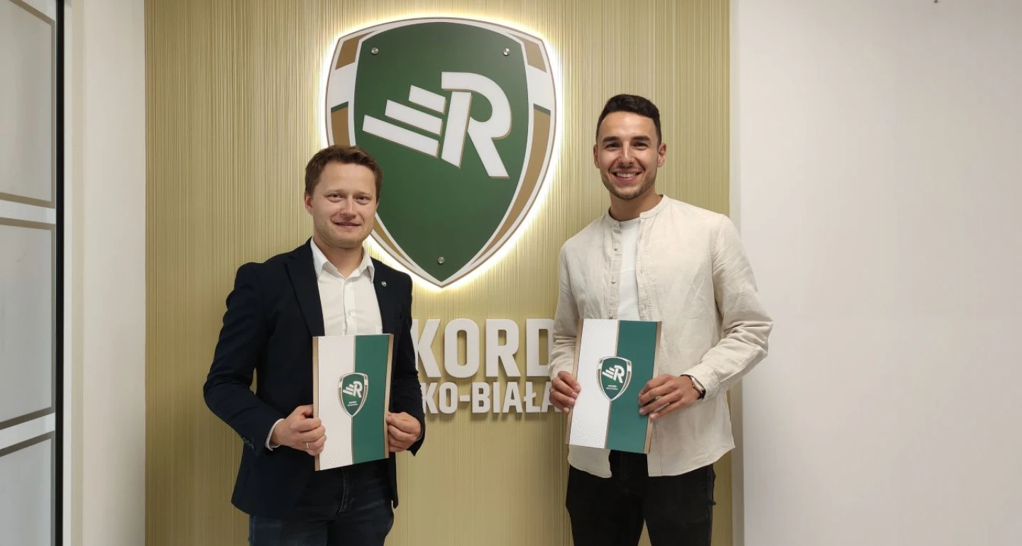 Niespełna 27-letni golkiper – na zdjęciu z Piotrem Szymurą, wiceprezesem zarządu klubu ds. sportu profesjonalnego – związał się z Rekordem trzyletnią umową.
