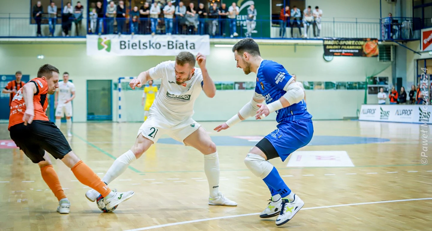 Świadomi braków kadrowych oraz perspektywy zbliżającego się pucharowego, półfinałowego rewanżu z Piastem bielszczanie, starali się możliwie szybko osiągnąć bramkową przewagę w starciu z ekipą dolnej części tabeli FOGO Futsal Ekstraklasy. Po dwóch golach Michała Marka (na zdjęciu), któremu dwakroć asystował Artur Popławski, wydawało się, że cel jest łatwy do osiągnięcia. Nawet zaskakujące trafienie Krystiana Kraśniewskiego nie zaburzyło spokoju w bielskich szeregach. Natomiast dało się dostrzec, że gra „rekordzistów” nie nabrała typowego dla gospodarzy tempa i wyrazistości.