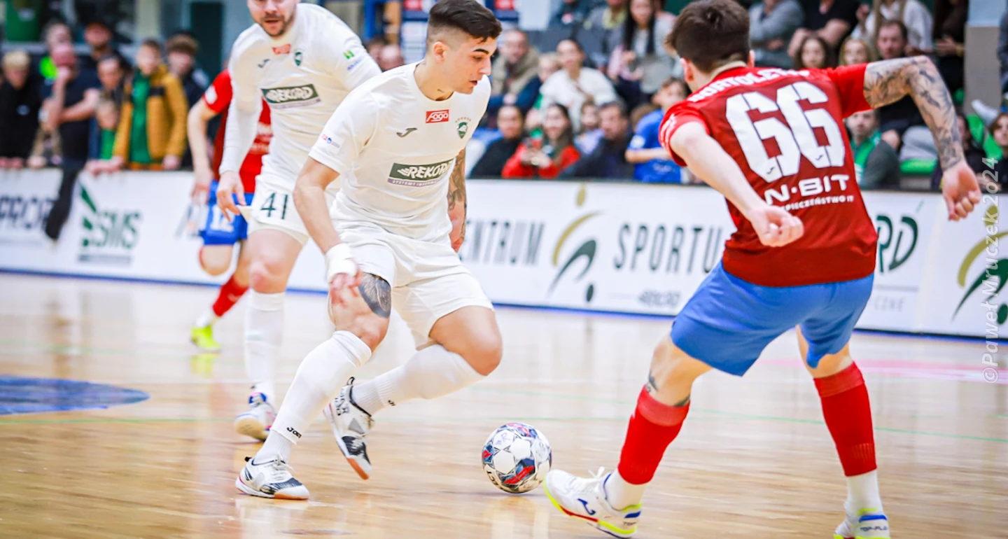 Pierwszych kilkanaście minęło, jakby graczom obu zespołów przyświecało hasło – po pierwsze, nie stracić. Kibicom bielszczan na moment zamarły serca, gdy z ewidentnym problemem zdrowotnym Bartłomiej Nawrat udał się w kierunku ławki rezerwowych. Szczęściem golkiper Rekordu i reprezentacji kraju szybko wrócił między słupki, zaliczając świetne zawody. Po raz pierwszy „lampka ostrzegawcza” zapaliła się biało-zielonym, gdy w 5. minucie „aluminium” obił Rafael Cadini. Zanim publiczność, która w nadkomplecie obserwowała spotkanie, ujrzała pierwszego gola, doszło do pierwszej z wielu kontrowersji. W środkowym sektorze boiska Vinicius Lazaretti bez pardonu powstrzymał Mikołaja Zastawnika. Żółtka kartka, przy impecie faulującego, była tzw. łagodnym wymiarem kary. Natomiast „rekordzista” jeszcze przed końcem pierwszej odsłony odwieziony został na badania lekarskie. „Majkiego” czeka najpewniej rozbrat z piłką, a na ile długotrwały, rozstrzygną dalsze konsultacje medyczne.