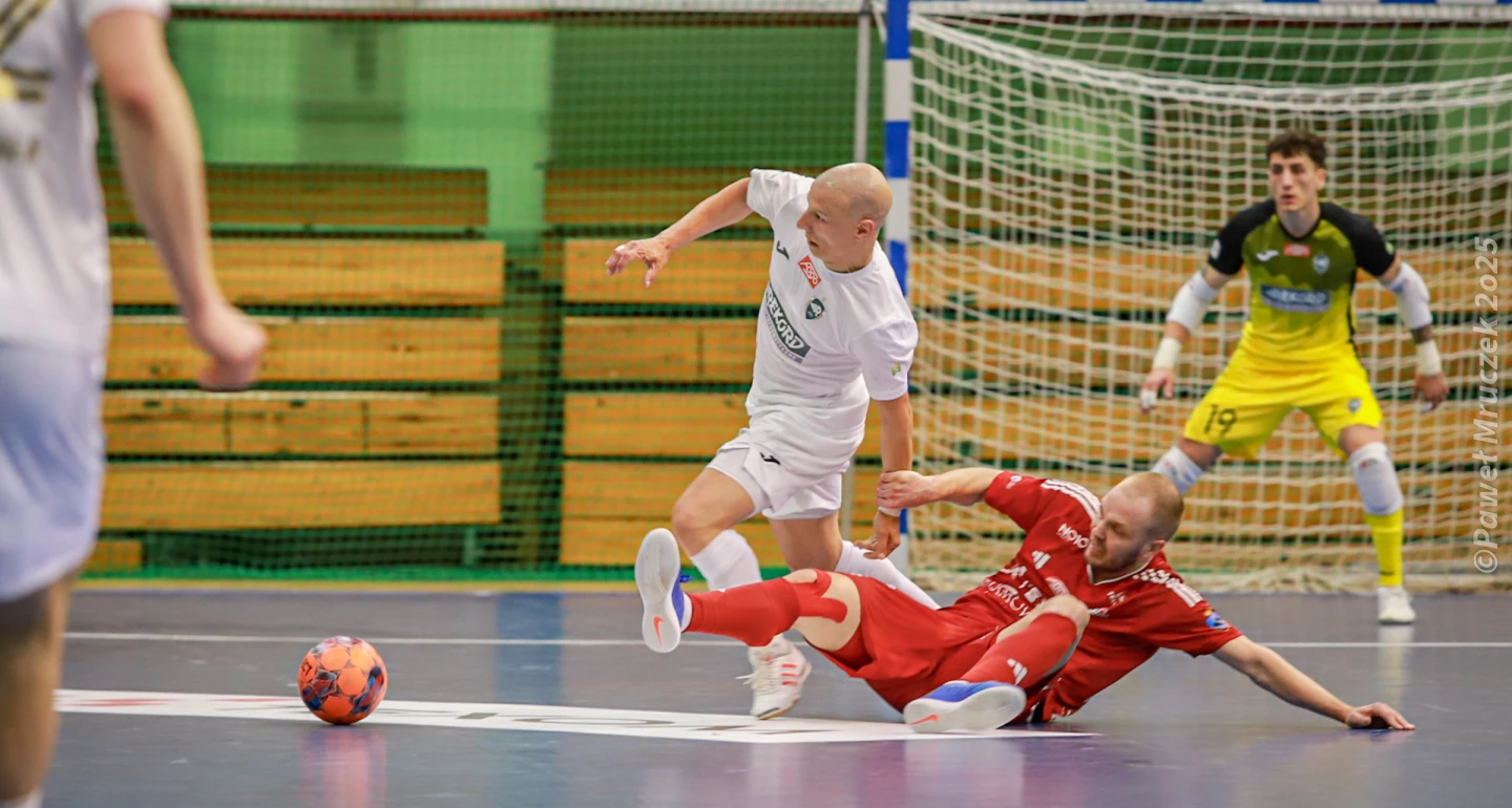 Sam początek spotkania otwierającego rywalizację w 1/4 finału nie zwiastował tego, co wydarzyło się na parkiecie hali „Widok” w następnych kilkudziesięciu minutach. Po przeprowadzonej z fantazją akcji w trójkącie: Stefan Rakić-Gustavo Henrique-Mikołaj Zastawnik, bielszczanie „z przytupem” otwarli rezultat. Przemyślanie rychło odpowiedzieli, co gorsza z bielskiej perspektywy, w prozaiczny, wręcz banalny sposób. Dwa kornery, dwa uderzenia z pierwszej piłki Artema Fareniuka i prowadzenie należało do gości. Miny „rekordzistów” zrzedły jeszcze bardziej, gdy po stracie piłki w środkowej strefie boiska do pojedynku z Krzysztofem Iwankiem ruszył Leo Santana. 37-latek z Brazylii nie zmarnował nadarzającej się okazji. Szansą na bramkowy kontakt mogło być silne uderzenie S. Rakicia z linii pola karnego, lecz piłka odbiła się od poprzeczki. W 14. minucie, po kolejnym rzucie rożnym przyjezdnych, A. Fareniuk był bardzo bliski skopiowania poprzednich, strzeleckich dokonań. Tym razem od utraty gola biało-zielonych uratował słupek. Identycznie, w 18. minucie zawodów „aluminium” przemyskiej bramki obił S. Rakić.