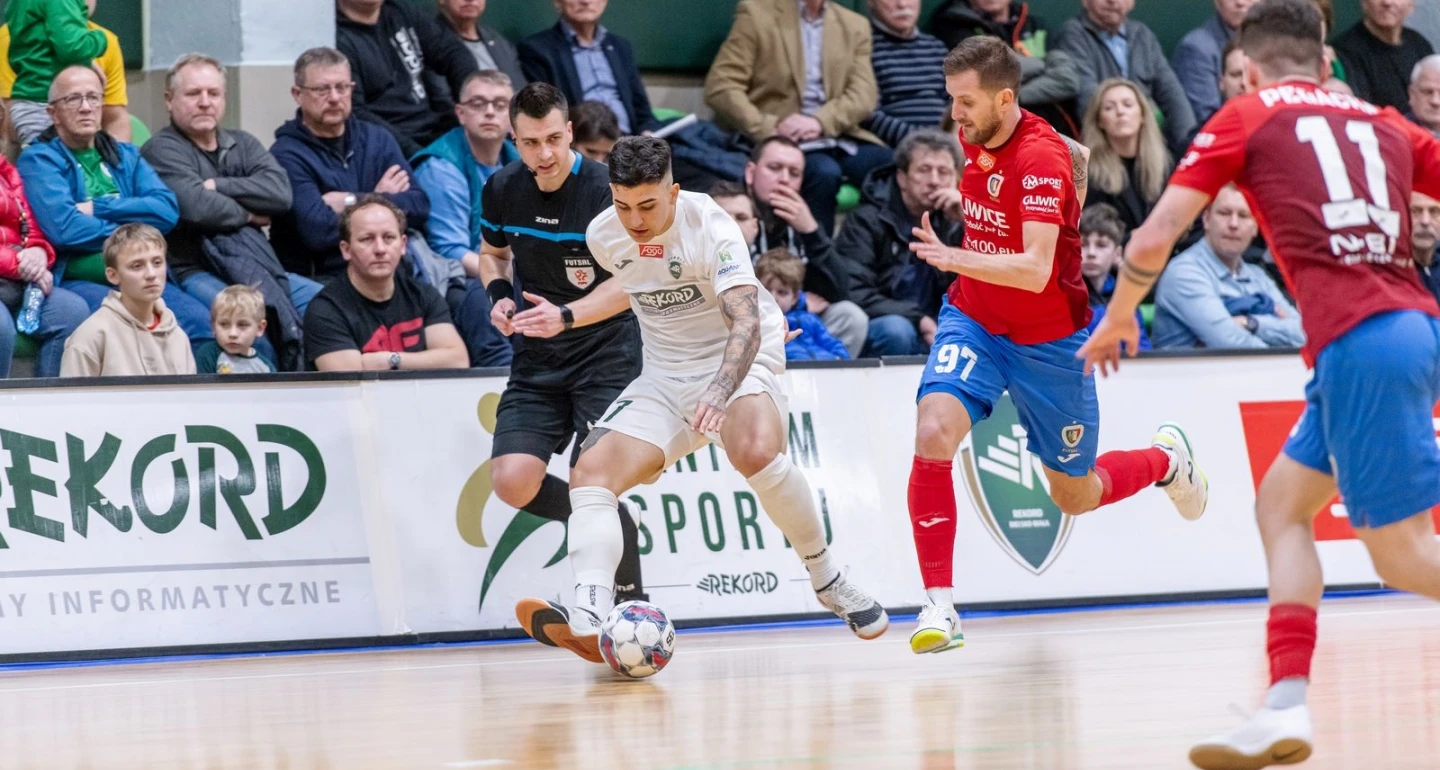 Zanim minęła szósta minuta hitu 24. kolejki, a gospodarze prowadzili już 3:0! Chyba nikt nie przewidział, że gliwiczanie pozwolą się zaskoczyć bielszczanom przy rozegraniu stałych fragmentów. Po kornerze Stefana Rakicia piłkę ulokował w bramce Matheus (na zdjęciu) Z kolei po podaniu z autu Pawła Budniaka strzał Michała Marka okazał się zbyt trudny do obrony dla bramkarza. Gracze Piasta jeszcze nie zdążyli się otrząsnąć, gdy otrzymali kolejny cios. Po kontrataku Matheusa futsalówkę z niewielkiej odległości skierował do bramki Mikołaj Zastawnik. Wyjąwszy groźny strzał Luisa Bortoletto z 7. minuty i „poprawkę” Bruno Gracy w poprzeczkę, wyglądało to tak, jakby „rekordziści” zamknęli mecz na długi czas, a klucz wyrzucili, gdzieś hen, daleko…
