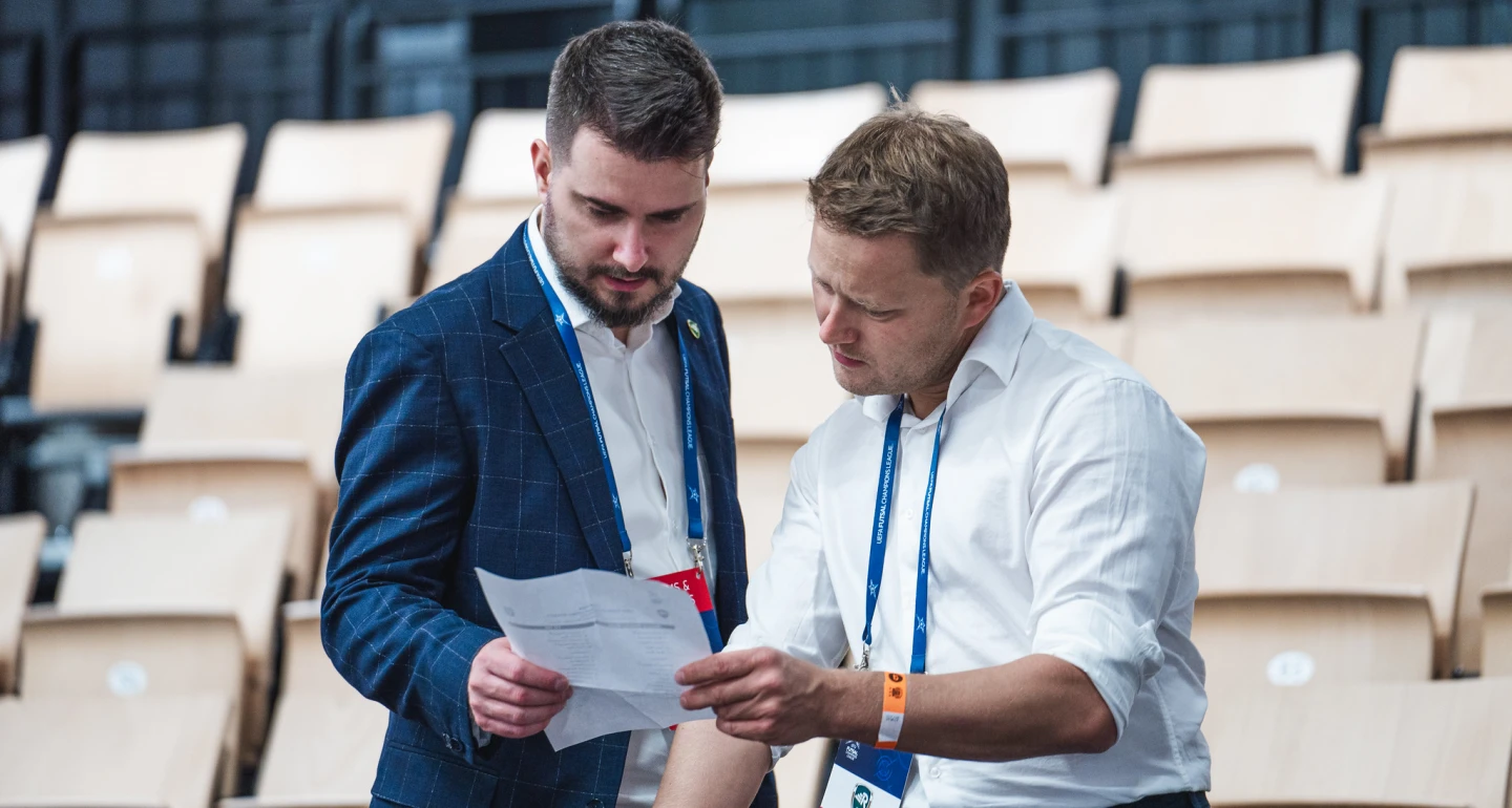 Piotr Szymura i Laurent Morel, menadżer rozgrywek futsalowych UEFA (z koszulką m.in. Islas Baleares Palma Futsal w tle)