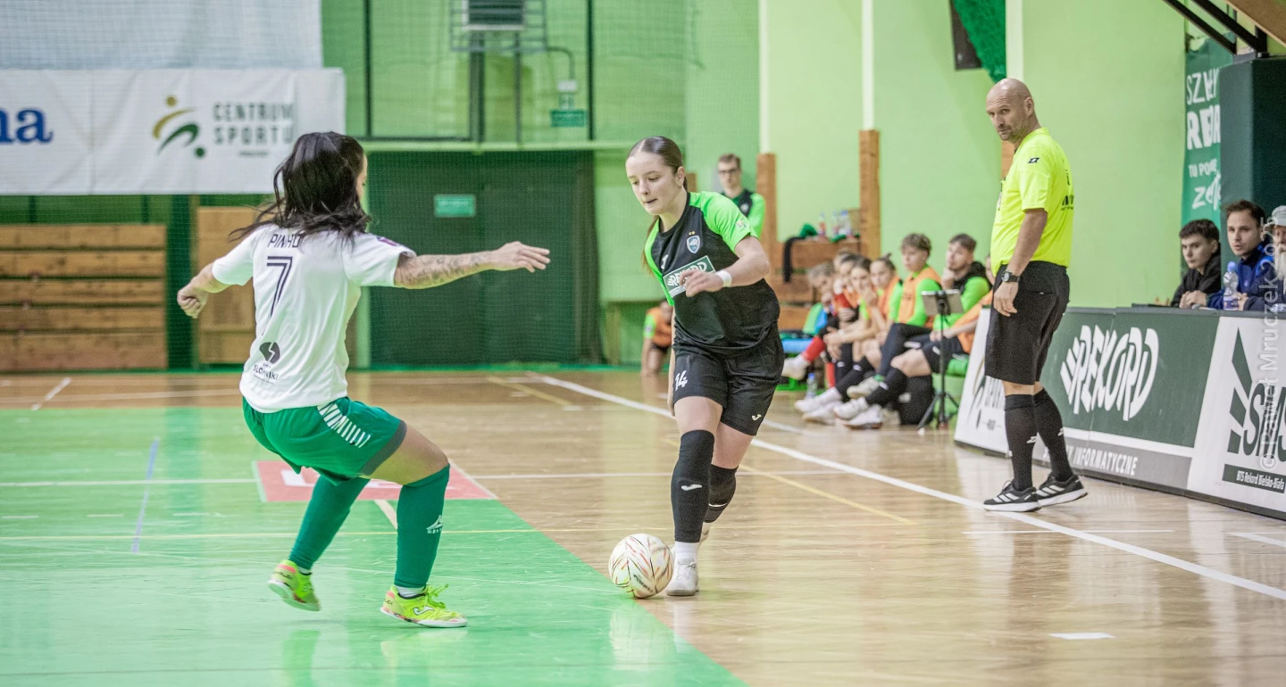 Druga połowa rozpoczęła się ekspresowo, od bramki dla AZS-u po strzale z dystansu Justyny Wójcik. Bierna postawa w obronie „rekordzistek” sprawiła, że pivotka miała czas i przestrzeń, żeby uderzyć. Trzy minuty później J. Wójcik wykonała akcję „kopiuj-wklej” z tym, że przy dalszym słupku strzał zamknęła Justyna Matusiak. W międzyczasie „biało-zielone” zdobyły dwie bramki. W 22. minucie M. Suwada ściągnęła „pajęczynę” z okienka bramki Oliwii Młynek. Chwilę później kontratak wyprowadził duet Oksana Shevchuk (na zdjęciu)-Maja Fal. Reprezentantka Ukrainy najpierw przejęła futsalówkę, a później zamknęła akcję.