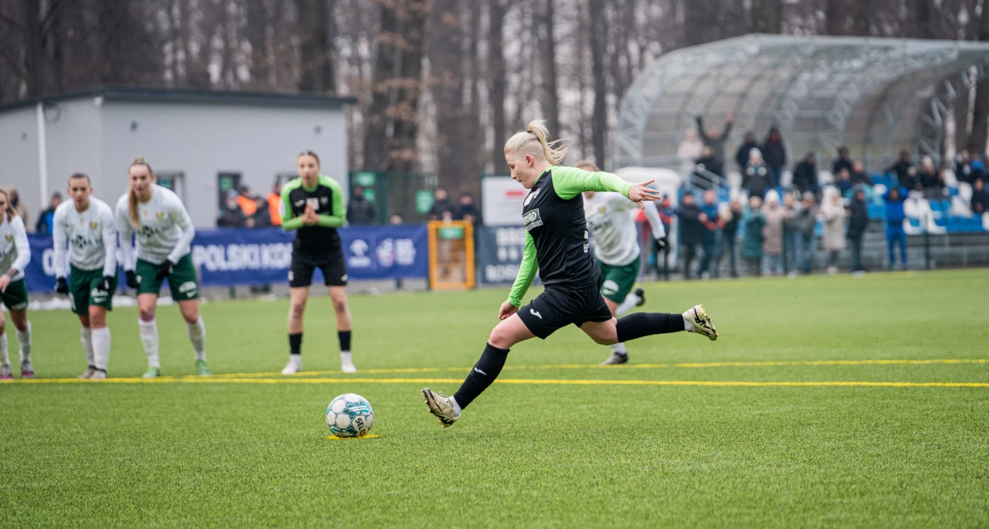 K. Adamek trafiła już w 2019 roku z TS ROW Rybnik w trakcie długotrwałego procesu rehabilitacji, po zerwaniu więzadeł krzyżowych. 24-latka pomogła „rekordzistkom” w sezonie 2020/21 w osiągnięciu historycznego awansu do Ekstraligi, notując dziesięć występów i zdobywając osiem goli. W debiutanckim sezonie w najwyższej klasie rozgrywkowej zawodniczka rozegrała 14 meczów, 8-krotnie wpisując się na listę strzelczyń. Po spadku biało-zielonych na dwa lata trafiła do wrocławskiego Śląska, skąd wróciła do klubu z Cygańskiego Lasu w czerwcu ubr. W naznaczonym kontuzjami sezonie 2024/2025 zaliczyła raptem sześć występów oraz jeden pucharowy. Kto mógł przypuszczać w połowie lutego br., że gol z rzutu karnego na 3:2 (na zdjęciu) ze Śląskiem na wagę awansu bielszczanek do ćwierćfinału PP będzie ostatnim w barwach Rekordu, ostatnim w karierze?