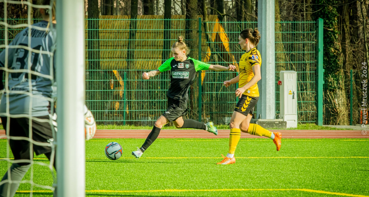 W dużym stopniu na grę biało-zielonych miał szybko stracony gol, który padł w podbramkowym zamieszaniu, po wcześniejszym dograniu sosnowiczanek z rzutu wolnego. Gol na 2:0 padł po trafieniu Klaudii Miłek, która umiejętnie wykorzystała źle zastawioną przez bielską obronę pułapkę ofsajdową. W tzw. międzyczasie po stronie aktywów Rekordu odnotować można dwie, groźne akcje zainicjowane przez Klaudię Olejniczak (na zdjęciu). Przy pierwszej skutecznie interweniowała bramkarka Czarnych, przy drugiej doszło do nieporozumienia Darii Długokęckiej z Aleksandrą Sudyk.
