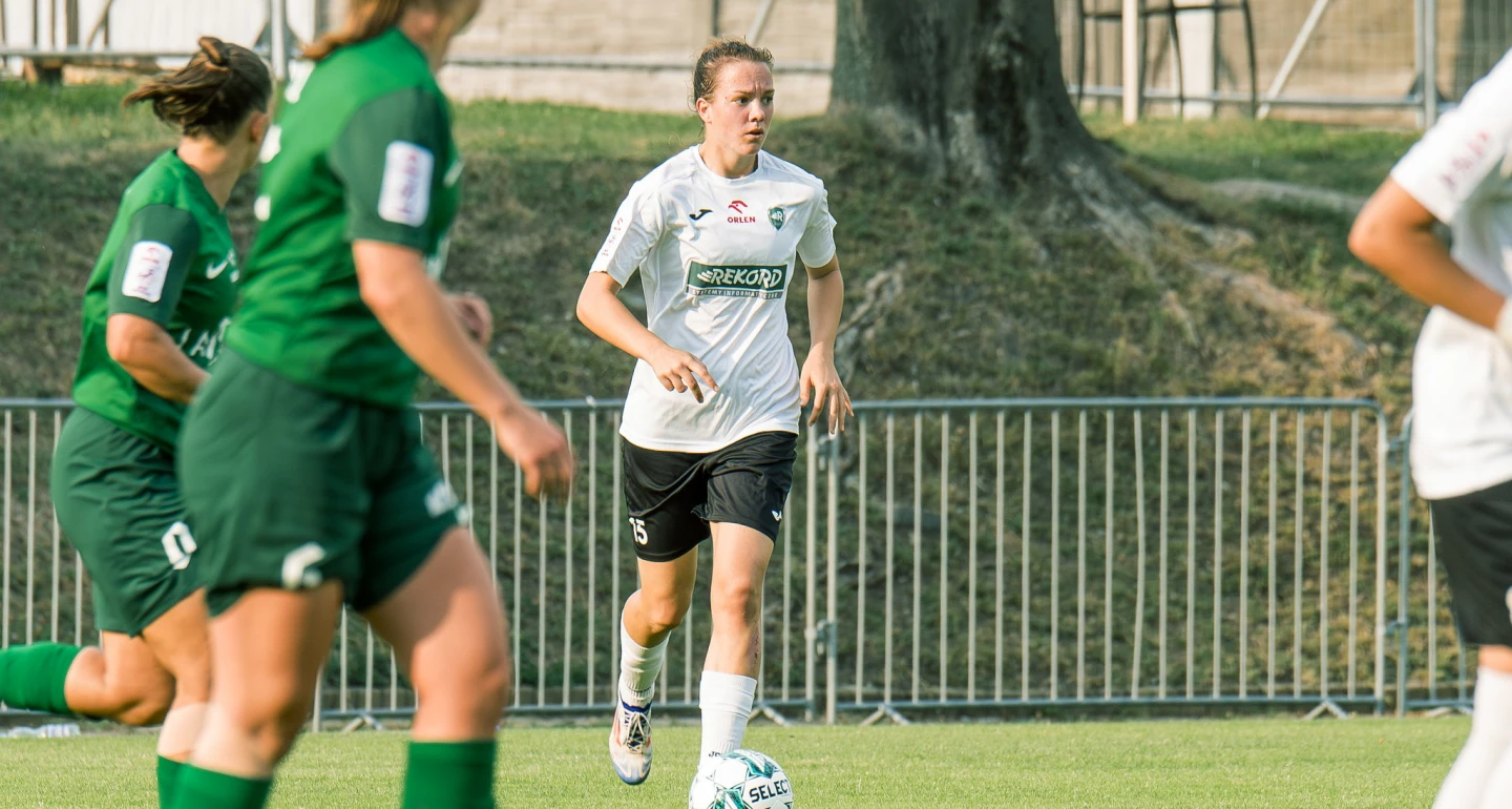 Trzy punkty zgarnęły faworyzowane gospodynie spotkania, wiceliderki tabeli Orlen Ekstraligi. W pierwszej odsłonie bielszczanki nienachalnie przypominały o sobie defensywie Czarnych. Tylko przy nielicznych, stałych fragmentach „rekordzistki” próbowały postraszyć miejscowe, jednak w trakcie trzech kwadransów nie udało się oddać strzału w światło bramki Julii Woźniak. Nieporównywalnie więcej sił i środków musiały biało-zielone zaangażować w obronie, co nie mogło zaskakiwać, wobec ofensywnego potencjału Czarnych. Bielska obrona, z jej „szefową” – Małgorzatą Lichwą (na zdjęciu), spisywała się bez zarzutu. Tym bardziej szkoda okoliczności, w jakich padł jedyny gol w tej fazie meczu. Po zbyt krótkim i niedokładnym wyprowadzaniu piłki spod własnego pola karnego futbolówka natychmiast wróciła w „szesnastkę” Rekordu. Tu mająca sporo swobody Zuzanna Grzywińska zdecydowała się na zaskakujący Kingę Ptaszek „centrostrzał”. Ku rozpaczy zespołu gości piłka wpadła do bramki…