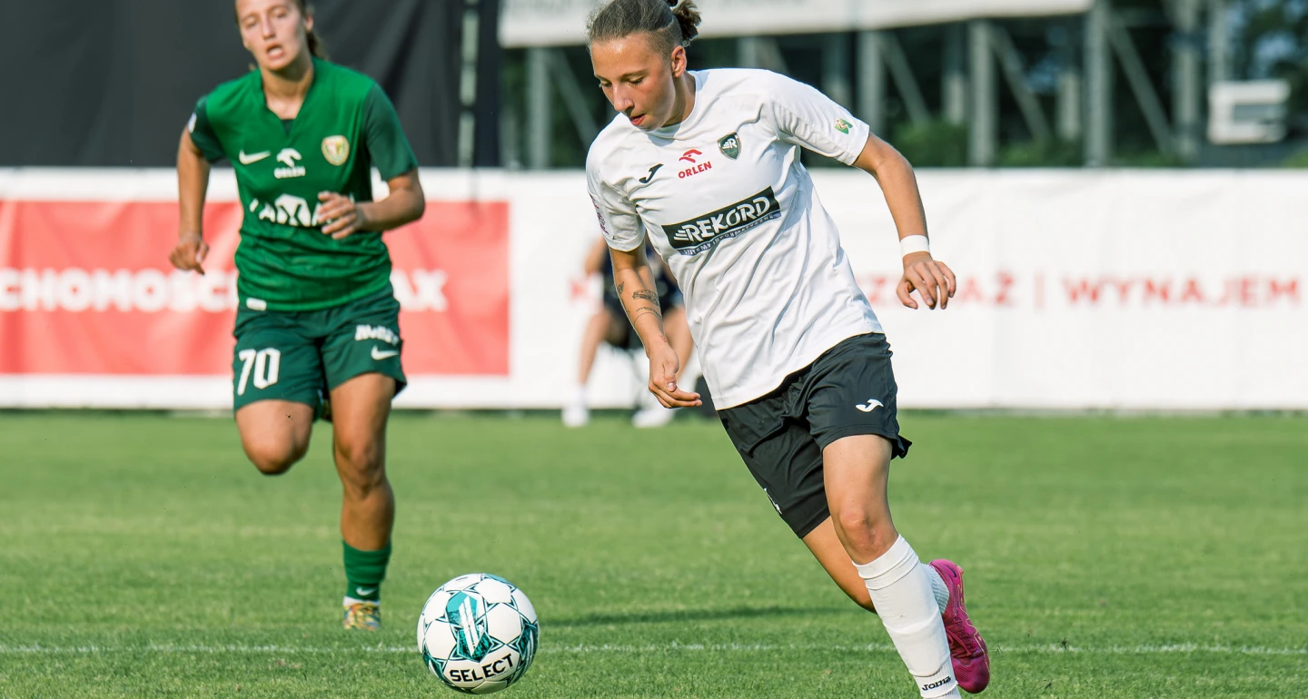 Mimo, że kibice zgromadzeni na trybunach nie ujrzeli żadnej bramki, to nie mogli narzekać na przebieg spotkania, zwłaszcza w drugiej połowie. Początek w wykonaniu obu drużyn był dość „nieśmiały”, badawczy. Dużo działo się w środku pola. Gospodynie próbowały „rozerwać” szczelny blok defensywny „rekordzistek”, rozrzucając piłki do skrzydłowych. Sprawczyniami największego zamieszania po stronie łodzianek były Paulina Filipczak wraz z Kamilą Osajkowską, które niejednokrotnie sprawdziły czujność oraz dyspozycję Martyny Gąsiorek oraz debiutującej w wyjściowej jedenastce, 16-letniej Julii Sikory. Po drugiej stronie mocno pracował duet: Daria Długokęcka – Julia Gutowska (na zdjęciu). Trzeba przyznać, że ilość fauli popełnionych na napastniczkach Rekordu była znacząca, a kapitan SMS-u – Patrycja Balcerzak bliska była obejrzenia drugiej żółtej kartki.