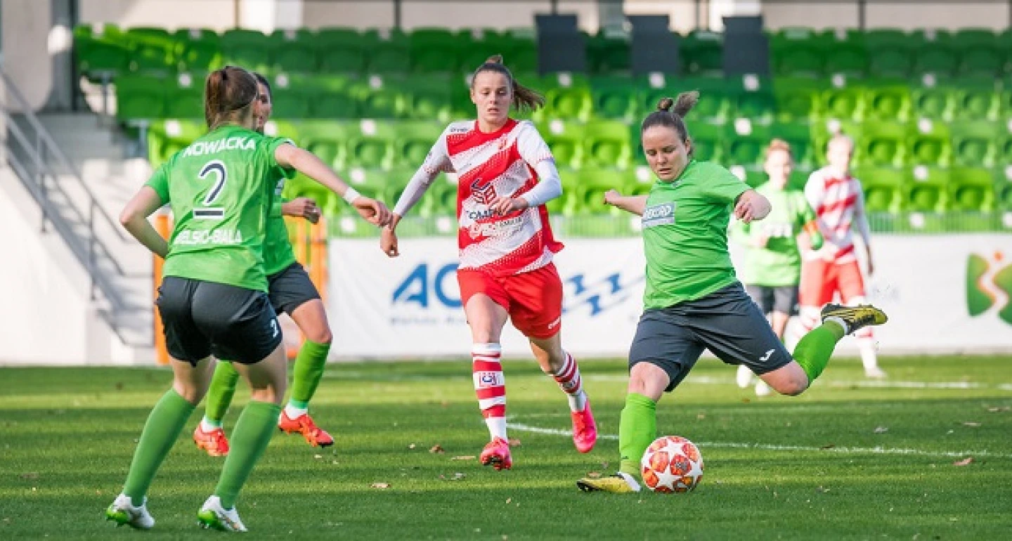 Po przerwie ekipa gości zaprezentowała się diametralnie inaczej, korzystniej. Już w siedem minut po wejściu na plac Katarzyna Moskała zaznaczyła swoją obecność uderzeniem w słupek. „Rekordzistki” z nazwijmy to trybu ekonomicznego przełączyły na typową dla siebie aktywność w ataku pozycyjnym oraz napieranie na rywalki wysokim pressingiem. W szeregu okazji bielszczanki wykorzystały tylko jedną, ale na wagę awansu. Do wybitej piłki z pola karnego dopadła Magdalena Knysak (na zdjęciu) i bez przyjmowania jej huknęła sprzed „szesnastki”. Ku zaskoczeniu nie tylko bramkarki z Konina futbolówka wylądowała w miejscu, gdzie pająk zwykł pleść swoje nici. Osiągniętej przewagi boiskowej oraz bramkowej biało-zielone nie oddały do gwizdka kończącego zawody.