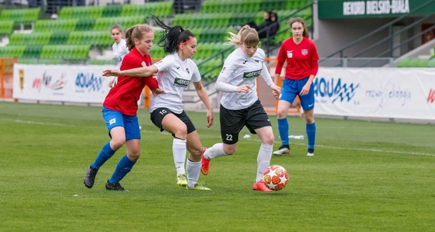 Trzy kwadranse pierwszej połowy nie olśniły poziomem gry. Po początkowej, obustronnej i krótkotrwałej wymianie ciosów, z golem dla zespołu gości tempo gry wyraźnie spadło. Bramkową akcję SWD zainicjowała ex-„rekordzistka” – Aleksandra Kaim, a po dośrodkowaniu z lewej strony Katarzyny Jaszek, głową celnie przymierzyła Julia Piętakiewicz. Po utracie gola bielszczanki wyraźnie straciły rezon, stres i presją w postawie biało-zielonych były, aż nadto widoczne. Podopiecznym Marcina Trzebuniaka niewiele kleiło się w ofensywie, a gdy jeszcze plac gry opuściła z kontuzją Magdalena Knysak, można było mieć uzasadnione obawy o dalszy przebieg meczu w wykonaniu gospodyń. Miała w 40. minucie niezłą okazję do wyrównania Klaudia Adamek (na zdjęciu przy piłce) obsłużona prostopadłym podaniem przez Klaudię Nowacką, zabrakło jednak strzeleckiej precyzji. Za to 180 sekund później K. Adamek optymalnie zamknęła szybki atak skrzydłem Katarzyny Moskały.