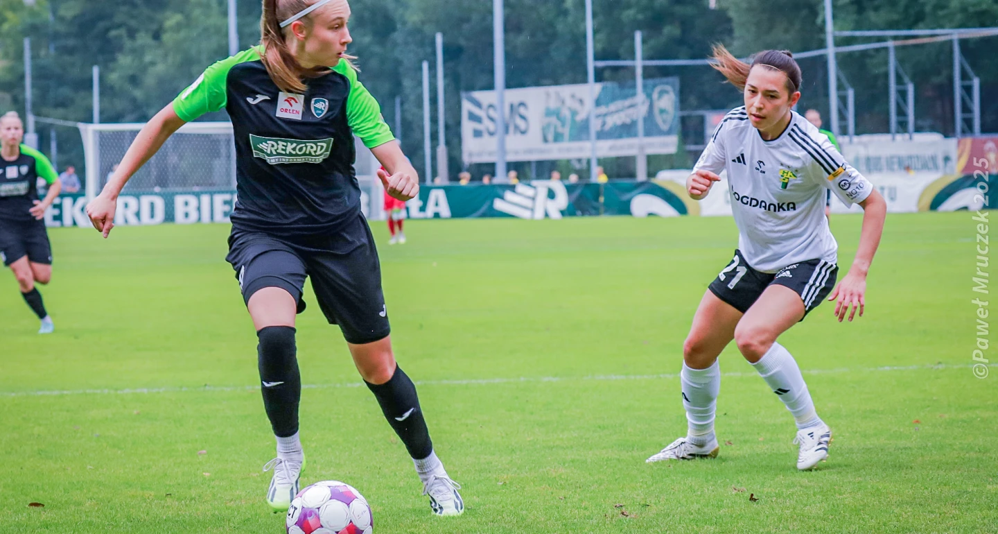 Pierwszą połowę w wykonaniu „rekordzistek” można podsumować frazesem: „festiwal niewykorzystanych sytuacji”. „Górniczki” za to stworzyły sobie dwie doskonałe okazje, obie za sprawą Anny Rędzi i wykorzystały je w stu procentach, jedną bramkową, drugą do wyeliminowania rywalki zz udzaiłu w spotkaniu. W 36. minucie doświadczona napastniczka nie pomyliła się w sytuacji sam na sam z Kingą Ptaszek. Już w doliczonym czasie gry, ta sama zawodniczka, wykorzystała doskonałe podanie od swojej koleżanki z zespołu oraz świadomość złego ustawienia Kristyny Janku. Defensorka Rekordu faulowała wychodzącą na pozycję A. Rędzię, za co ujrzała bezpośrednią czerwoną kartkę. Bielszczanki jednak nie tylko powinny doprowadzić do remisu, co prowadzić… Uderzeniami na bramkę z rzutów wolnych nękały Natalię Piątek Roksana Gulec i Dominika Dereń. Kapitan przyjezdnych dwukrotnie wyszła zwycięsko w starciu „oko w oko” z Darią Długokęcką. Napastniczka nie wykorzystała również doskonałego dośrodkowania D. Dereń, kierując piłkę obok słupka.