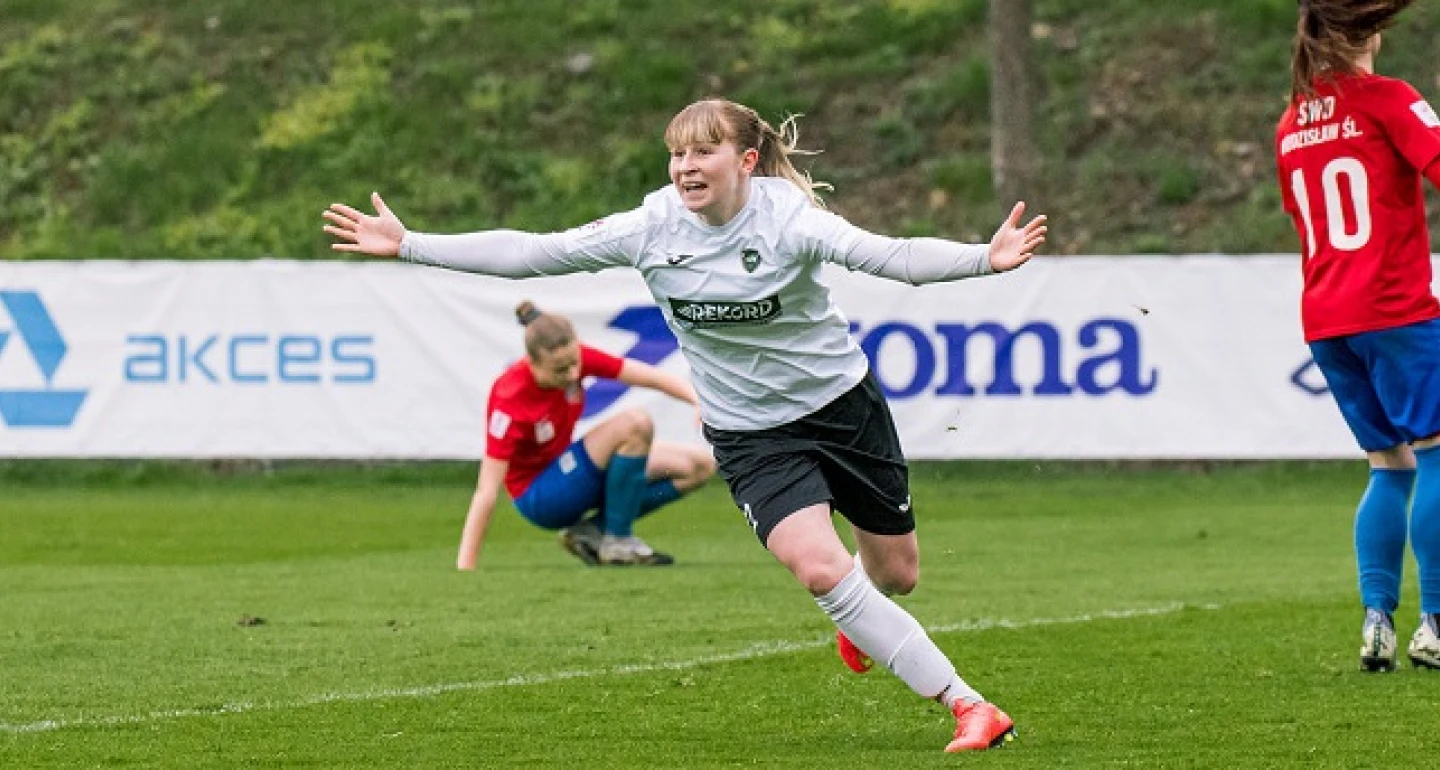 Pierwszy gol dla „rekordzistek” padł po rzucie karnym, podyktowanym za faul na Julii Gutowskiej. Drugie trafienie, to majstersztyk autorstwa Klaudii Adamek (na zdjęciu). Napastniczka Rekordu po przyjęciu piłki (asysta Karoliny Czyż) przed polem karnym Resovii, podbiła futbolówkę i z półobrotu, z powietrza uderzyła nie do obrony.