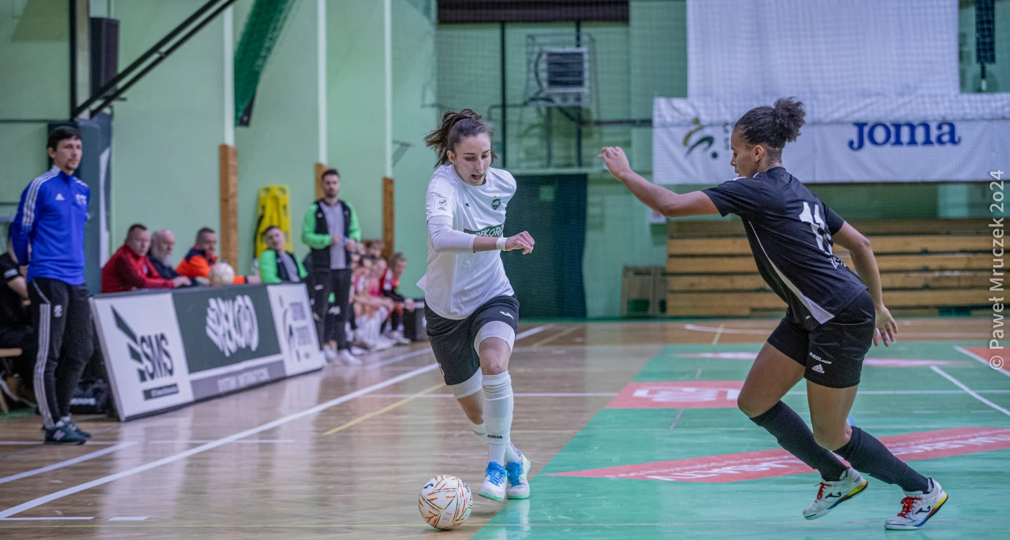 Jeśli ktokolwiek myślał, że bielszczanki zejdą z wysokich obrotów w drugiej połowie, to srogo się pomylił. Konsekwentna realizacja założeń przyświecała poczynaniom podopiecznych S. Jani. W 31. minucie świetnie w obronie popracowała Anna Chóras. Skrzydłowa urwała się rywalkom i tylko w sobie znany sposób dostrzegła nadbiegającą drugą stroną Izabelę Tracz (na zdjęciu, przy piłce), umieszczając futsalówkę w pustej bramce. Cztery minuty później I. Tracz otrzymała podanie-„ciasteczko”, z głębi pola, od O. Shevchuk i pewnie ustrzeliła dublet. Kilka sekund później O. Shevchuk wzięła sprawy w swoje nogi i umieściła piłkę przy bliższym słupku bramki.