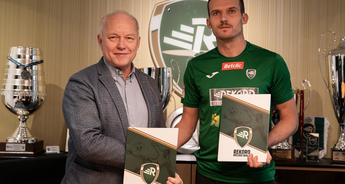 Z nowym „rekordzistą” – Tomaszem Boczkiem, na zdjęciu z prezesem Januszem Szymurą, m.in. o wieloletniej karierze, jej bielskich „akcentach” oraz nowym rozdziale przy Startowej.