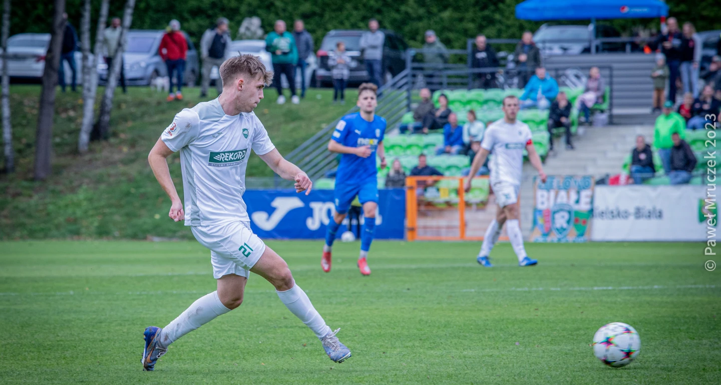 Aktywność w ofensywie, ruchliwość i umiejętne wykorzystywanie błędów rywali, w tych elementach należy upatrywać klucza do przewagi, jaką bielszczanie osiągnęli w trzech kwadransach pierwszej odsłony. Już w 6. minucie bliski zaskoczenia zabrzańskiej defensywy był Daniel Kamiński, skończyło się kornerem. 120. sekund później obrońcy Górnika II nie upilnowali na skrzydle Filipa Walusia, który wyłożył piłkę D. Kamińskiemu w polu bramkowym. Reszta była zwyczajną formalnością. Spokój w bielskich szeregach zmącił wyrównujący gol Dawida Niedźwieckiego, który przejął zbyt lekkie zagranie wstecz Mateusza Pańkowskiego i celnie uderzył przy dalszym słupku. Co gorsza, gospodarze mogli objąć prowadzenie w 20. minucie. Po strzale z 8-9-u metrów D. Niedźwieckiego refleksem popisał się Krzysztof Żerdka. W odpowiedzi niecelnie lobował bramkarza rywali Daniel Świderski, ale że co się odwlecze… Po świetnym, płaskim dograniu Szymona Noconia (na zdjęciu) „w piątkę” napastnik Rekordu pokonał Mateusza Jelenia. 16-latek w bramce rezerw Górnika raz jeszcze zmuszony był do wyciągnięcia futbolówki „z sieci” po fantastycznym uderzeniu, z 16-u metrów, z woleja Sz. Noconia.