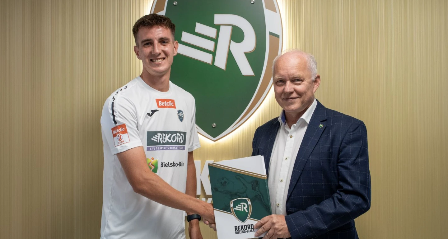 Roczną umową z bielskim drugoligowcem związał się Wojciech Łaski, na zdjęciu z prezesem klubu – Januszem Szymura. 25-latek jest wychowankiem MOSiR-u Jastrzębie, w przeszłości reprezentował: Płomień Połomia, Pniówek ’74 Pawłowice oraz GKS Jastrzębie-Zdrój, z którego w 2022 roku trafił na dwa lata do Jagiellonii Białystok, rozgrywając w tym czasie 21 spotkań na poziomie ekstraklasy i zdobywając dwa gole. W. Łaski sięgnął z Dumą Podlasia po mistrzostwo kraju, w rozgrywkach 2023/24.