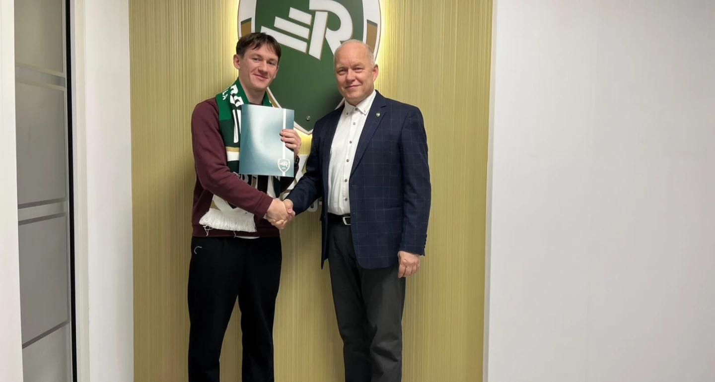 21-letni Ralfs Maslovs, na zdjęciu z prezesem Januszem Szymurą, zasilił „rekordzistów” wiążąc się półroczną umową, z opcją przedłużenia. Lewonożny wahadłowy trafił do klubu z Cygańskiego Lasu z ekstraklasowego (Virsliga) FS Jelgava, zespołu który ukończył rozgrywki sezonu 2024 na dziesiątej pozycji.