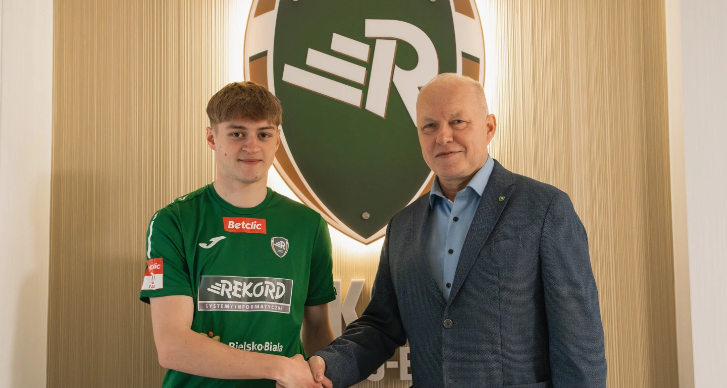 To bezsprzecznie wzmocnienie kadry naszych drugoligowców, do biało-zielonych dołącza Szczepan Mucha, na zdjęciu z prezesem Rekordu – Januszem Szymurą.