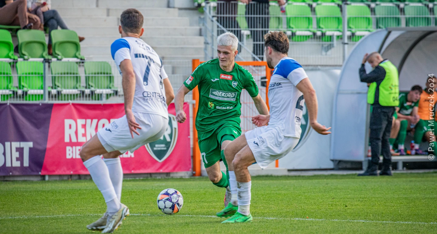 W 3. minucie Mateusz Tekieli (na zdjęciu) był bardzo bliski premierowego trafienia, przegrał jednak w sytuacji „oko w oko” z Przemysławem Popczykiem. Czego nie zrobili „rekordziści”, uczynili gospodarze. Po chytrze rozegranym rzucie wolnym i strzale Jakuba Pieloka z 10-11-stu metrów gospodarze objęli prowadzenie. Na 2:0 rezultat podwyższył „z wapna” Damian Adamiecki, a rzut karny podyktowany został po przewinieniu Jakuba Targosza.