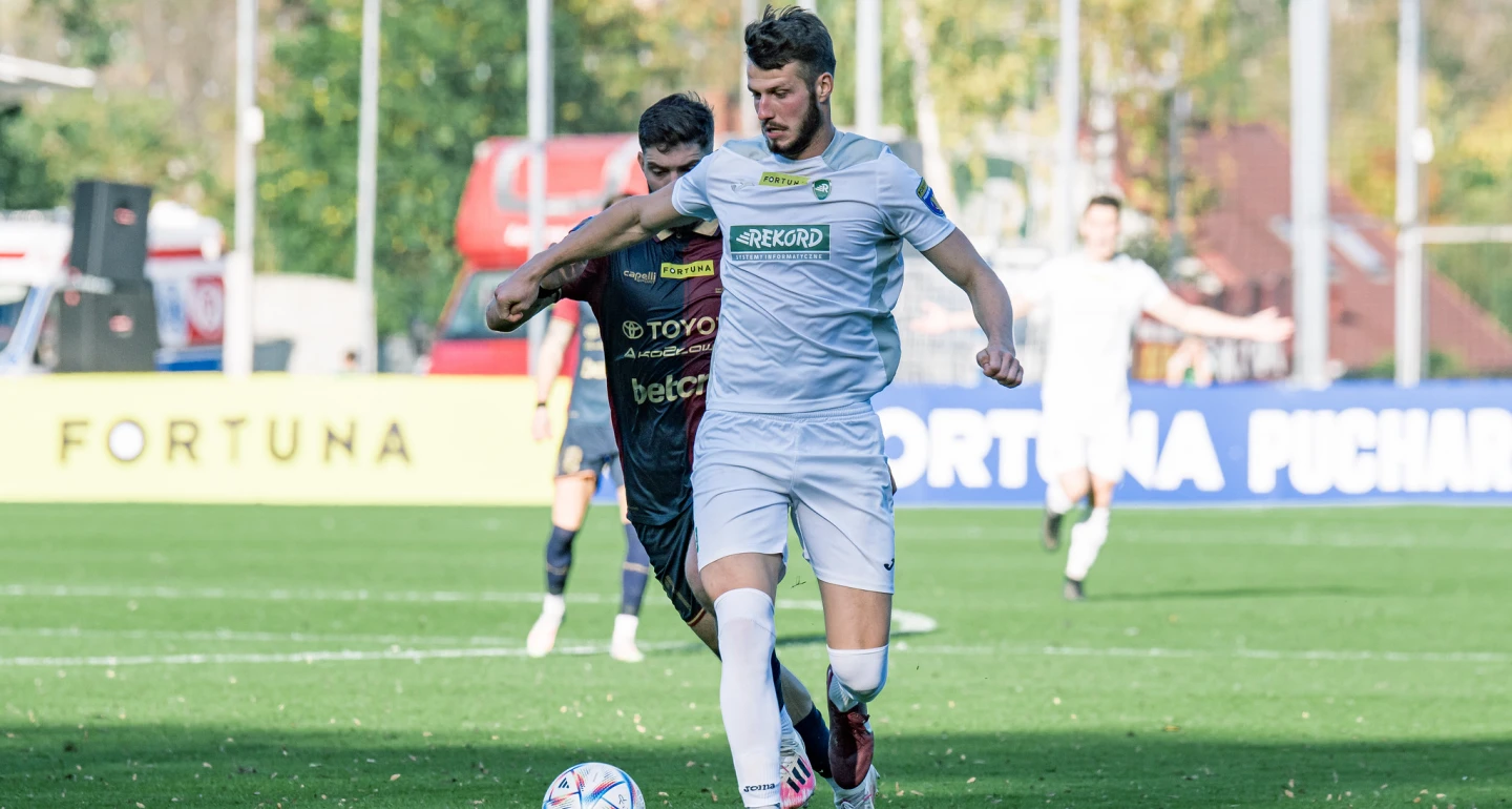 Na reakcję trenera Dariusza Mrózka nie trzeba było długo czekać. Szkoleniowiec biało-zielonych zastosował manewr znany z wcześniejszych meczów m.in. w Gorzowie Wielkopolskim i Kluczborku, desygnując na boisko Daniela Świderskiego. Gra duetem napastników wyraźnie ożywiła poczynania gości. W 62. minucie Marcin Wróbel (na zdjęciu) główkował wprost w Kacpra Trelowskiego, a trzy minuty później – w podobnych okolicznościach – piłka minęła światło bramki. Gola na 1:1 doczekaliśmy po kolejnym, szybkim ataku ekipy z Cygańskiego Lasu. Role główne odegrali obaj ofensywni gracze Rekordu – D. Świderski asystował płaskim podaniem, M. Wróbel chytrze ulokował futbolówkę w bramce.