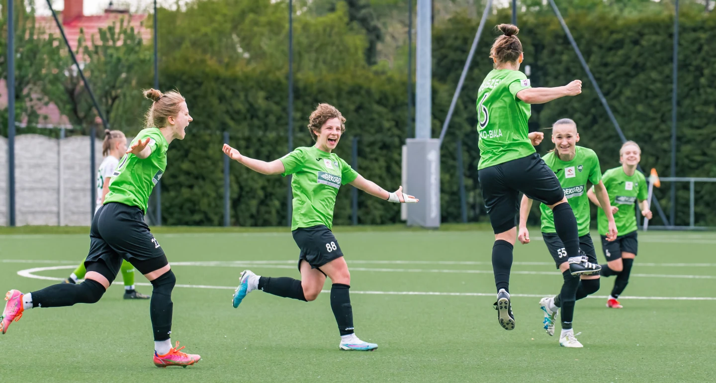 - Jestem bardzo zadowolony, że właśnie w taki sposób przypieczętowaliśmy nasz awans – mówi Mateusz Żebrowski. - Nie było łatwo, bo świadomość, że w tym spotkaniu do awansu wystarczy nam remis trochę „powiązała nogi” i na przerwę schodziliśmy przegrywając 0:1, ale ostatnie pół godziny było już naszym popisem. Strzał Martyny Gąsiorek, dobitka Klaudii Kubaszek i pieczęć Kasi Moskały dały nam dziesiąte zwycięstwo na naszym boisku w tym sezonie. Jest to duży wyczyn. Na pewno nasza murawa jest specyficzna i to nam bez wątpienia pomogło pokonać nawet liderujące Stomilanki Olsztyn, które przegrały tylko ten jeden raz, ale nasze dobre mecze na boiskach rywalek także świadczą o tym, że dziewczyny w pełni zasłużyły na ten awans. Bardzo dobrze zagraliśmy na przykład jesienią na wyjeździe ze Skrą Częstochowa wygrywając 5:1. Istotne było też zwycięstwo w drugiej kolejce w Wodzisławiu Śląskim 2:1, bo dodało wiary i pewności siebie. Natomiast bolesna porażka 1:4 w Olsztynie też była ważna, bo długo leżała nam na wątrobie i napędzała do pracy oraz stanowiła motywację.