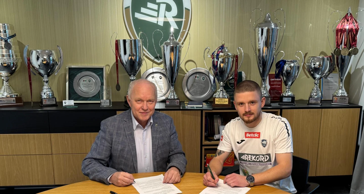 Niespełna 27-letni Łukasz Soszyński, na zdjęciu z prezesem Januszem Szymurą, związał się z naszym klubem półroczną umową, z opcją przedłużenia. Defensywny pomocnik jest wychowankiem Zagłębia Lubin, skąd trafiał kolejno do: gdyńskiej Arki, Sokoła Ostróda i Lechii Zielona Góra. Od początku rozgrywek 2022/23, przez 2,5 sezonu, występował w Stali Stalowa Wola, z którą w krótkim czasie przebył drogę awansu z trzeciej do pierwszej ligi. W jesiennej części sezonu 2024/25 wystąpił w 12-stu meczach Betclic 1. Ligi oraz dwóch potyczkach Pucharu Polski.