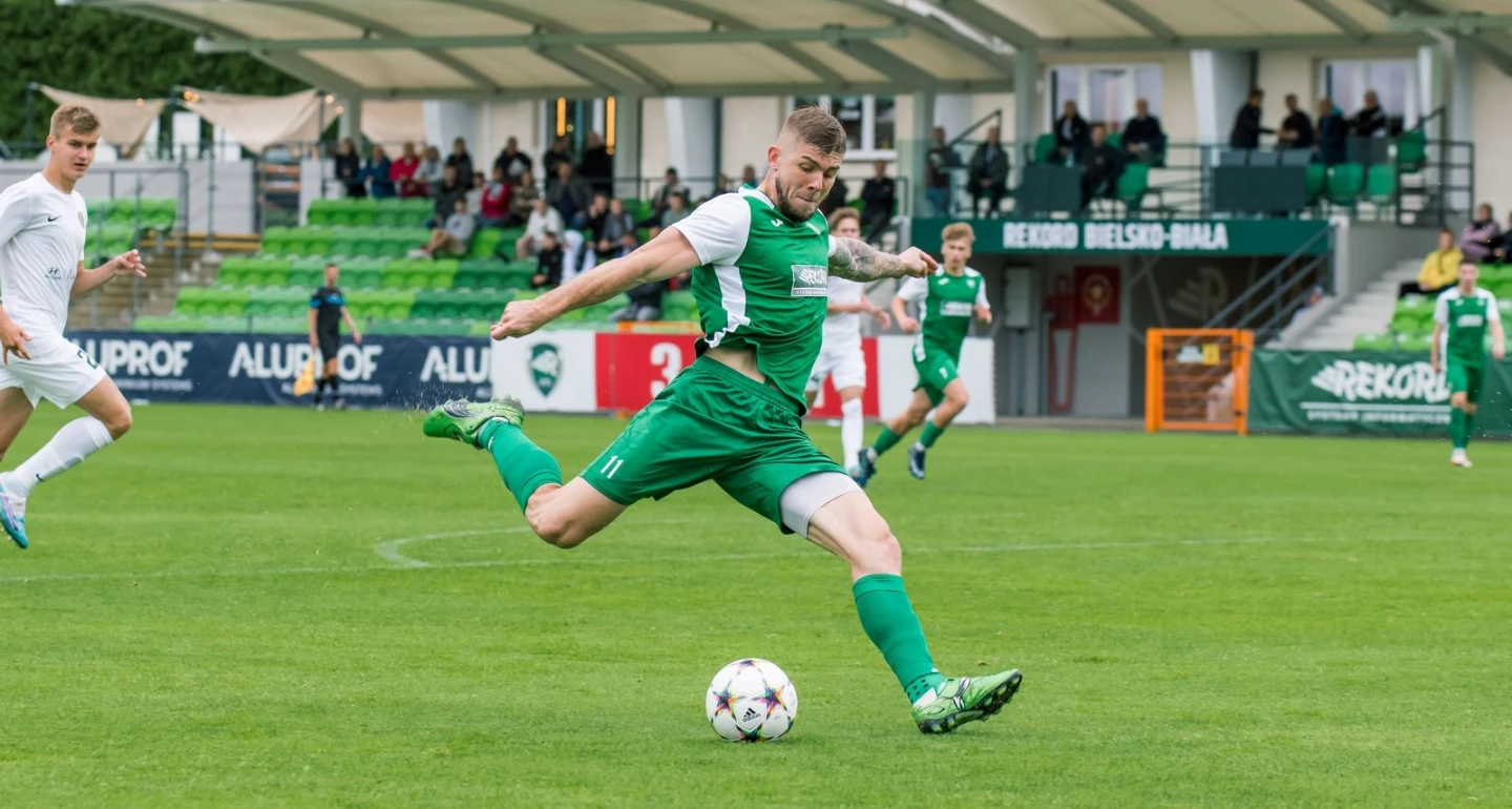 Bielszczanie z dużym animuszem rozpoczęli potyczkę ze spadkowiczem z drugiej ligi. O ile Tomasz Nowak niecelnie uderzył z rzutu wolnego (2. min.), to już przy strzałach Daniela Iwanka i Daniela Świderskiego (na zdjęciu) do dużego wysiłku zmuszony został strzegący bramki Śląska II – Mateusz Górski. Po mocnym otwarciu na kolejnych kilkanaście minut inicjatywę przejęli wrocławianie, cierpliwie budując swoją grę w ataku pozycyjnym. Coraz bardziej skoncentrowani na ofensywie przyjezdni dali się zaskoczyć w 23. minucie. Po płynnej i dynamicznej akcji oraz wymianie kilku podań przez m.in. Piotra Wyrobę i Filipa Walusia, precyzyjnie trafił lewą nogą, zza linii pola karnego T. Nowak. Radość biało-zielonych trwała raptem kilkadziesiąt sekund. Po strzale Jakuba Jezierskiego piłkę sparował Jakub Szumera, ale już przy dobitce Yehora Sharabury golkiper Rekordu był bezradny. Dziewięć minut później, przy utracie drugiego gola, golkiper gospodarzy musi jednak większą część winy wziąć na siebie. Piłka po strzale 19-letniego Ukraińca nie powinna nastręczać większych kłopotów, a jednak… Mimo ostrego kąta formalności dopełnił Kacper Zaborski. W 41. minucie strzelec drugiego gola mógł jeszcze bardziej pogrążyć „rekordzistów”. Po dośrodkowaniu Dawida Matuszewskiego J. Zaborski główkował w poprzeczkę.