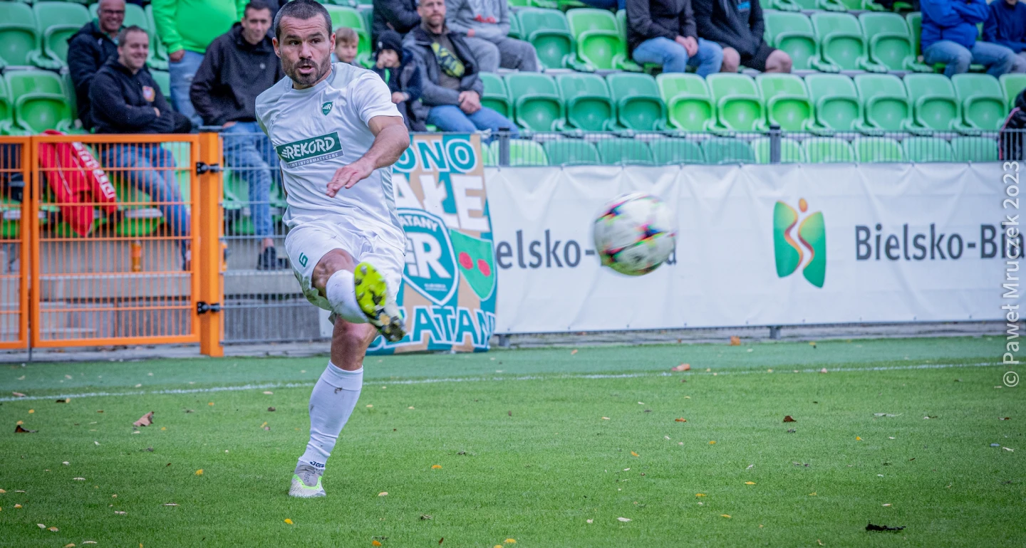 Tymczasem po wizycie w Cygańskim Lesie LKS-u Goczałkowice-Zdrój „Startowa 13” utraciła krótkotrwały, kilkumiesięczny status niezdobytej twierdzy. Pal sześć, najistotniejsze że po przegranej 0:2, skądinąd po całkiem ciekawym obustronnie widowisku, bielszczanie zareagowali w najlepszy z możliwych sposobów. „Rekordziści” pojechali do Bytomia Odrzańskiego z jasno nakreślonym planem taktycznym, którego realizacji nie zakłócili gospodarze nie za bardzo chętni do podjęcia otwartej gry. Wiary we własny potencjał biało-zielonych nie zachwiał nieuznany (drugi z rzędu!) gol Daniela Świderskiego. Kiedy nie udawało się wywieść w pole bytomian w ataku pozycyjnym, sięgnięto po wypróbowany sposób – stałe fragmenty. Nie pierwszy raz tegorocznej jesieni w rolach głównych przy rozegraniu stojącej piłki wystąpili Tomasz Nowak (na zdjęciu) z Kacprem Kasprzakiem.