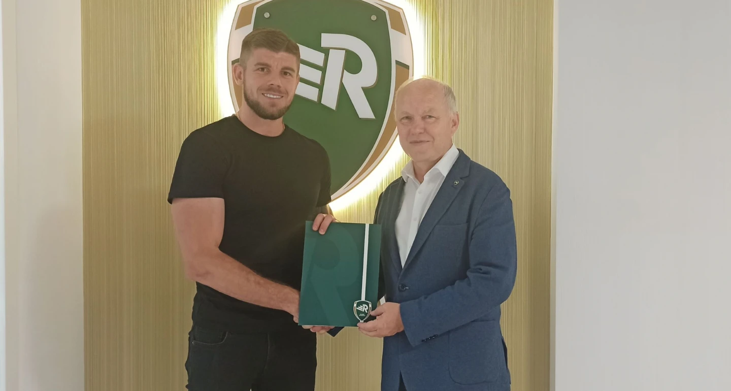 Daniel Świderski i prezes Rekordu Janusz Szymura (obaj na zdjęciu) podpisali nową umowę, obowiązującą do końca sezonu 2023/24.