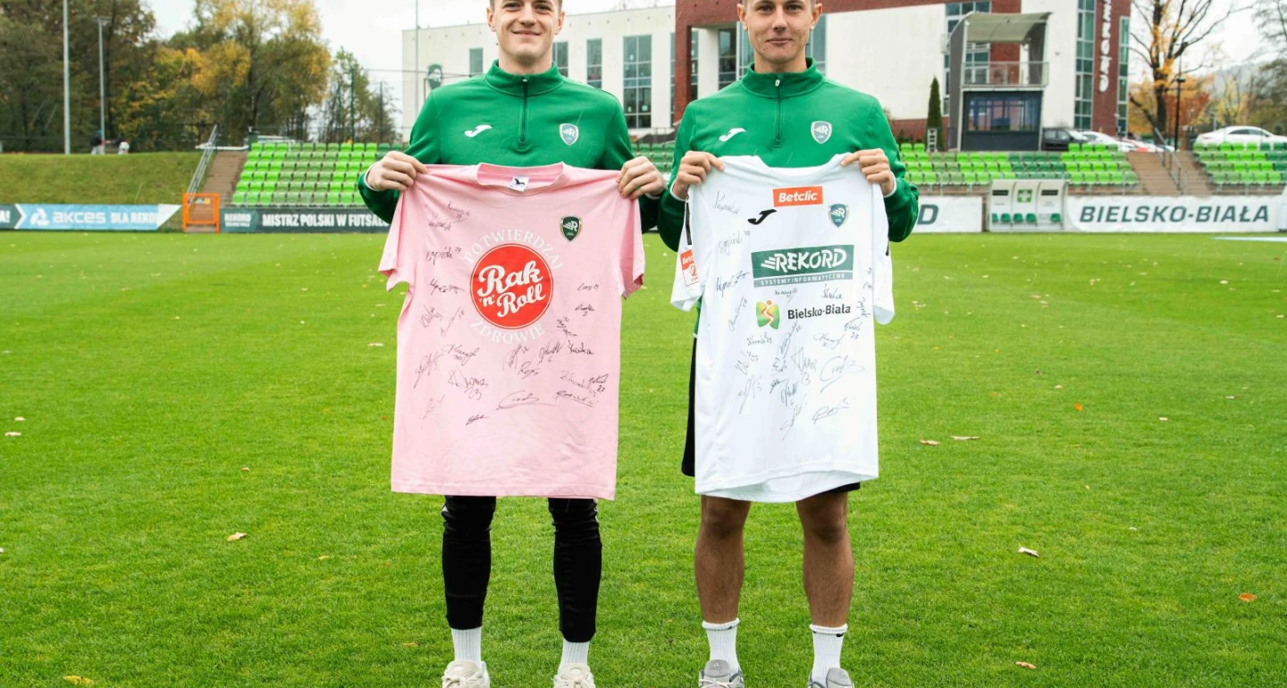 W sobotę drugoligowcy, nazajutrz drużyna siedmiokrotnych mistrzów Polski w futsalu (na zdjęciu poniżej), wyszli na swoje spotkania ligowe odziani w okolicznościowe koszulki, przypominając i wspierając akcję uświadamiania zagrożenia nowotworem piersi. Idąc dalej, futbolowi „rekordziści” przekazali na aukcję dwie koszulki - meczową i okolicznościową, obie z autografami naszych drugoligowców, obie prezentowane (na górnym zdjęciu) przez Michała Śliwkę i Mateusza Tekielego. Licytować można do 9 listopada br., do godz. 10:10, po kliknięciu - tutaj. Zachęcamy, zapraszamy...