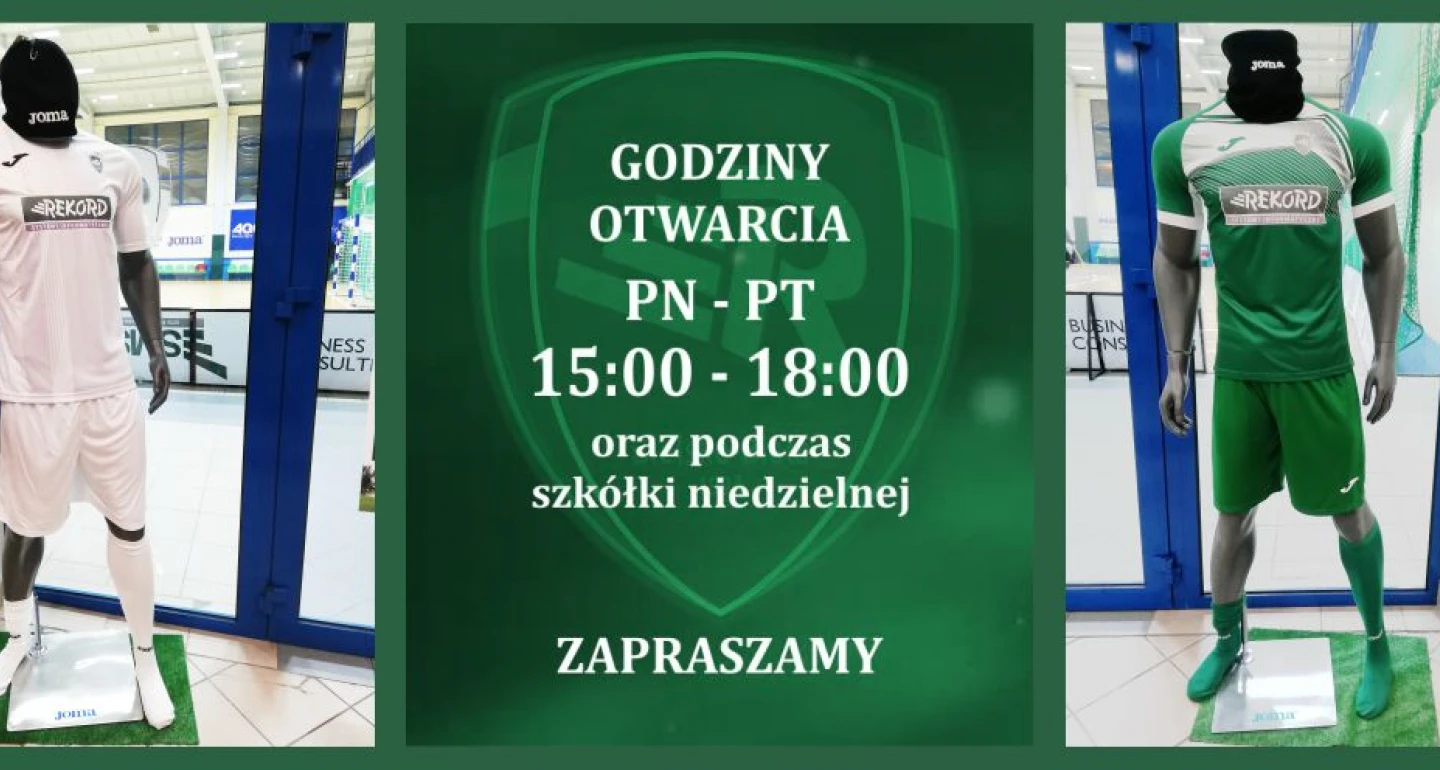 Od poniedziałku do piątku, w godzinach od 15:00 do 18:00 oraz w trakcie niedzielnych zajęć Szkółki Piłkarskiej, zapraszamy do odwiedzin i zakupów w sklepie „Joma”, w hali Rekordu. Tam do nabycia pełna gama, cały asortyment sprzętu sportowego, nie tylko w biało-zielonych barwach. Tam także pierwsze nowości hiszpańskiej marki z kolekcji „Wiosna 2021”. Zapraszamy!