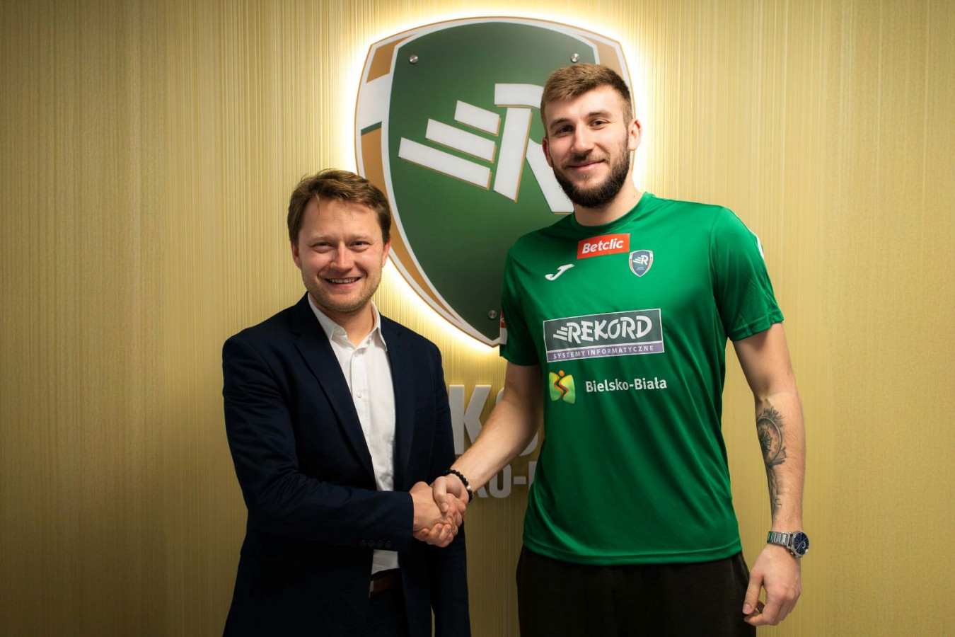 Mateusz Broda, na zdjęciu z wiceprezesem naszego klubu - Piotrem Szymurą, zasilił szeregi biało-zielonych drugoligowców.