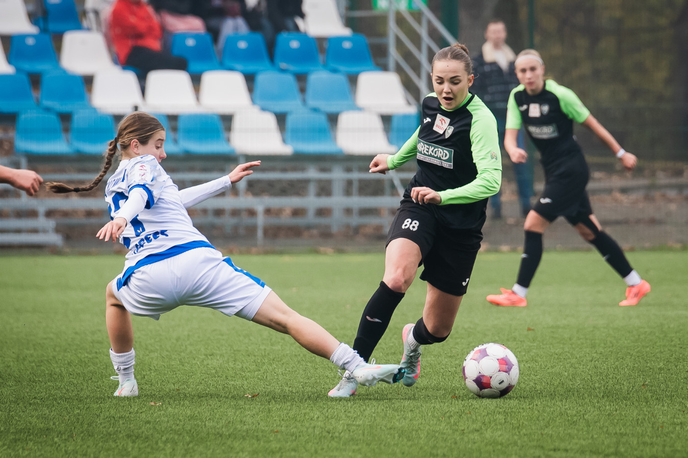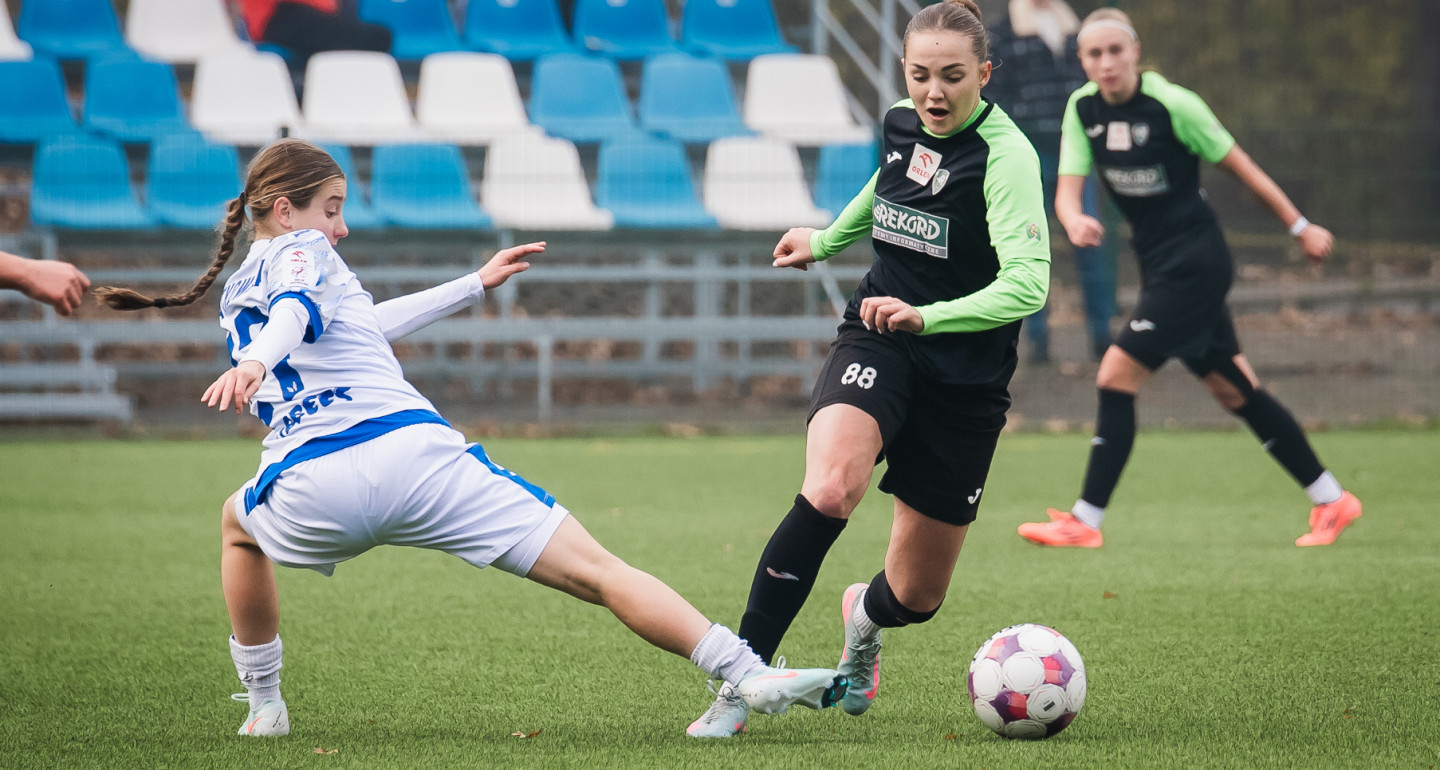 Miały swoje szanse "rekordzistki", miały je również i "lechitki", jednak żadna ze stron nie miała wystarczającej ilości argumentów, żeby przechylić szalę na swoją korzyść. Cała pierwsza połowa rozgrywała się głównie w środku pola. Trzykrotnie szybkim atakiem popisały się "lechitki". Dwukrotnie na wysokości zadania stanęła Kinga Ptaszek, raz przyjezdne zaprzepaściły dogodną akcję. Bielszczanki za to wyprowadziły akcję, która powinna zakończyć się bramką. Roksana Gulec (na zdjęciu) świetnie wyszła na pozycję, jednak jej silne, płaskie uderzenie wybroniła Jagoda Sapor. Ekwilibrystyczna dobitka ofensywnej pomocniczki przeleciała nad poprzeczką.