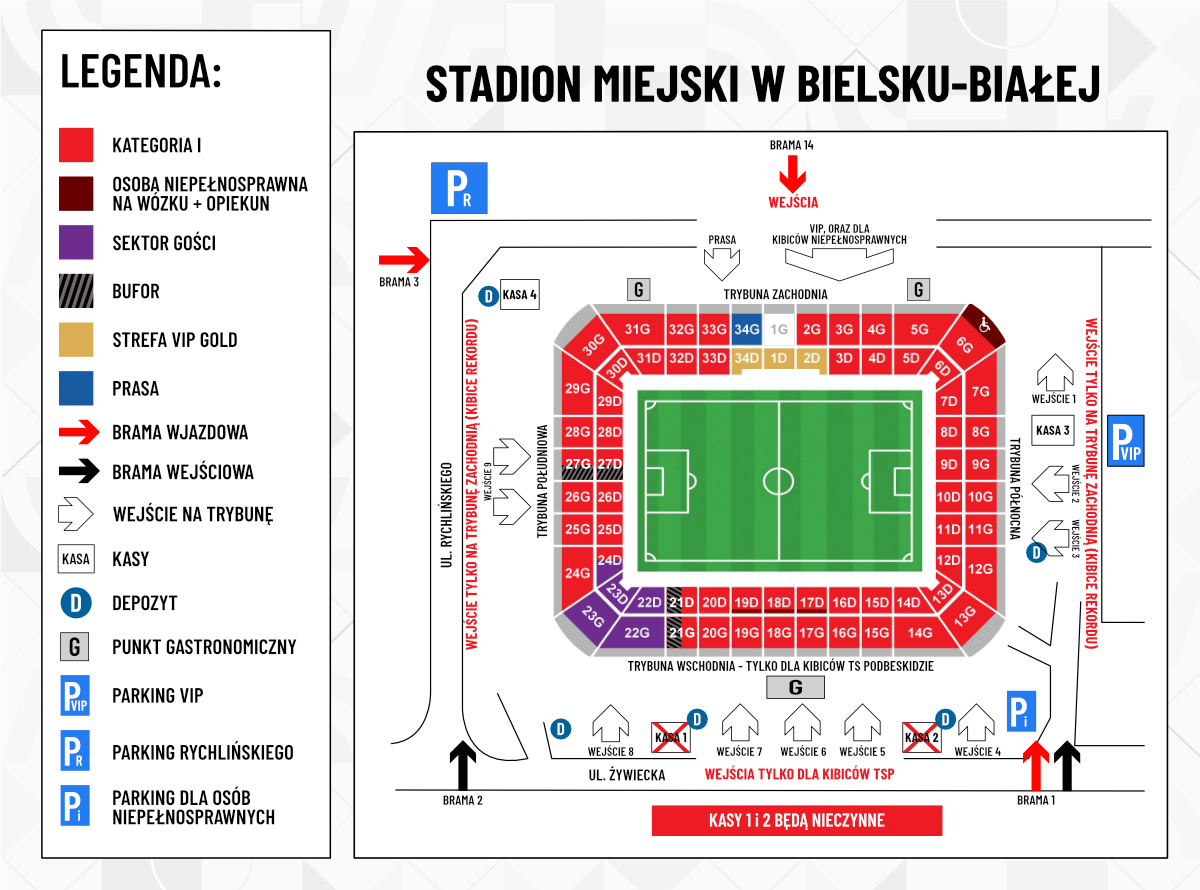 Wejścia na obiekt dla kibiców, którzy zakupili bilety na naszej stronie internetowej lub w kasie, będą usytuowane od strony południowej i północnej, którymi należy się udać na sektory umiejscowione po stronie zachodniej stadionu. Przy tych wejściach nie będą działały bilety zakupione przez stronę internetową TS Podbeskidzie. Należy również pamiętać, że wejścia od strony wschodniej (od ulicy Żywieckiej) przeznaczone są wyłącznie dla kibiców, którzy nabyli bilety na stronie internetowej TS Podbeskidzie, a wejściówki kupione w naszym systemie biletowym nie będą przy tych wejściach działały.
