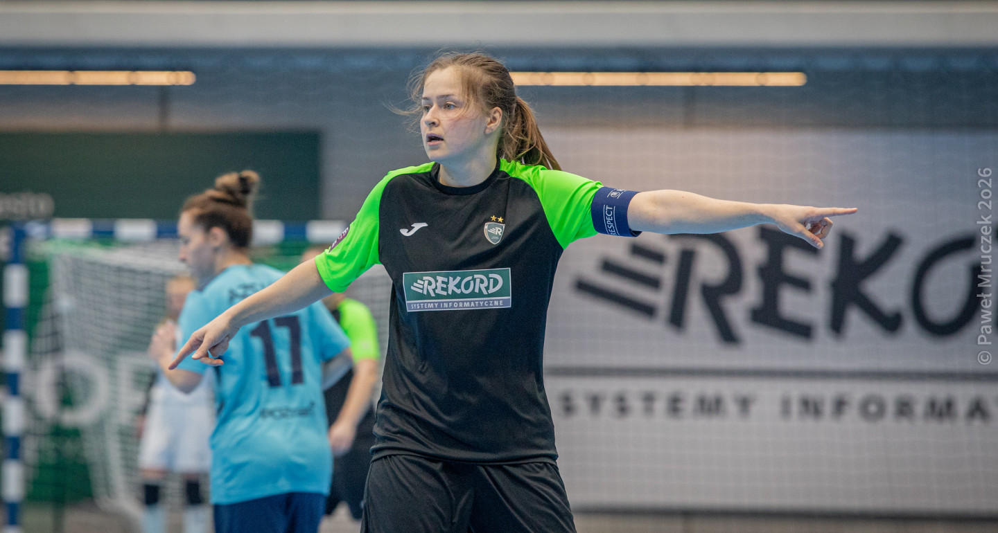 W drugiej części „biało-zielone” podkręciły tempo. W 25. minucie przy linii bocznej, na wysokości pola karnego, faulowana została M. Fal i to właśnie ona otworzyła wynik spotkania po podaniu z rzutu wolnego od O. Shevchuk. "Akademiczki" musiały śmielej ruszyć do ataku, ale wciąż dobrze w obronie pracowały gospodynie. Dwie świetne interwencje zaliczyła Maja Rębiś (na zdjęciu) oraz A. Bzowska. Kapitan „rekordzistek” w 29. minucie wzięła sprawy "w swoje nogi" i płaskim strzałem, przy słupku, podwyższyła wynik meczu. Bramka na 3:0 była wypracowana przez M. Fal, która najpierw odebrała futsalówkę na połowie Krakowianek, a następnie przełamała ręce bramkarki.
