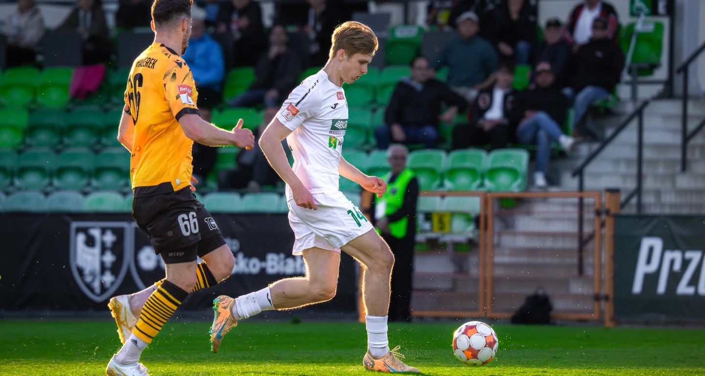 Na tym samym dystansie „rekordziści” zgromadzili 16 „oczek”. Tu nie bez znaczenia jest seria czterech spotkań bez przegranej. Co istotne, bodaj po raz pierwszy po zwycięskich derbach biało-zieloni poszli za ciosem, wygrali następną potyczkę ligową. Piać z zachwytów nad stylem wygranej 2:1 z Resovią nie zamierzamy, natomiast musimy podkreślić nie pierwsze wiosną, wartościowe wejścia zmienników z ławki rezerwowych. Udział Michała Hornika (na zdjęciu) przy trafieniu Wojciecha Łaskiego niepodważalny, tak jak asysta przy tym trafieniu Jana Ciućki. Parę minut wcześniej J. Ciućka otworzył rezultat, zapisując jedenastego gola w bieżących rozgrywkach. Jeśli jeszcze na swój wysoki poziom - czego jesteśmy pewni - wróci Daniel Świderski, siła bielskiego ognia będzie jeszcze mocniejsza. Skądinąd popularny „Świder” dobrze zapisał się pamięci kibiców w Stalowej Woli, gdy w trzecioligowym sezonie 2021/22 zaliczył 14 trafień, w 27 występach.