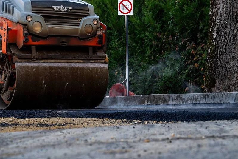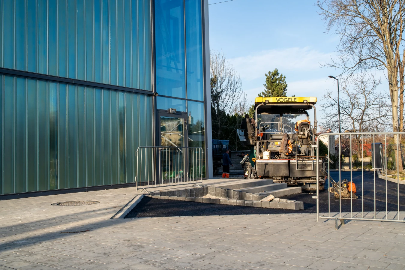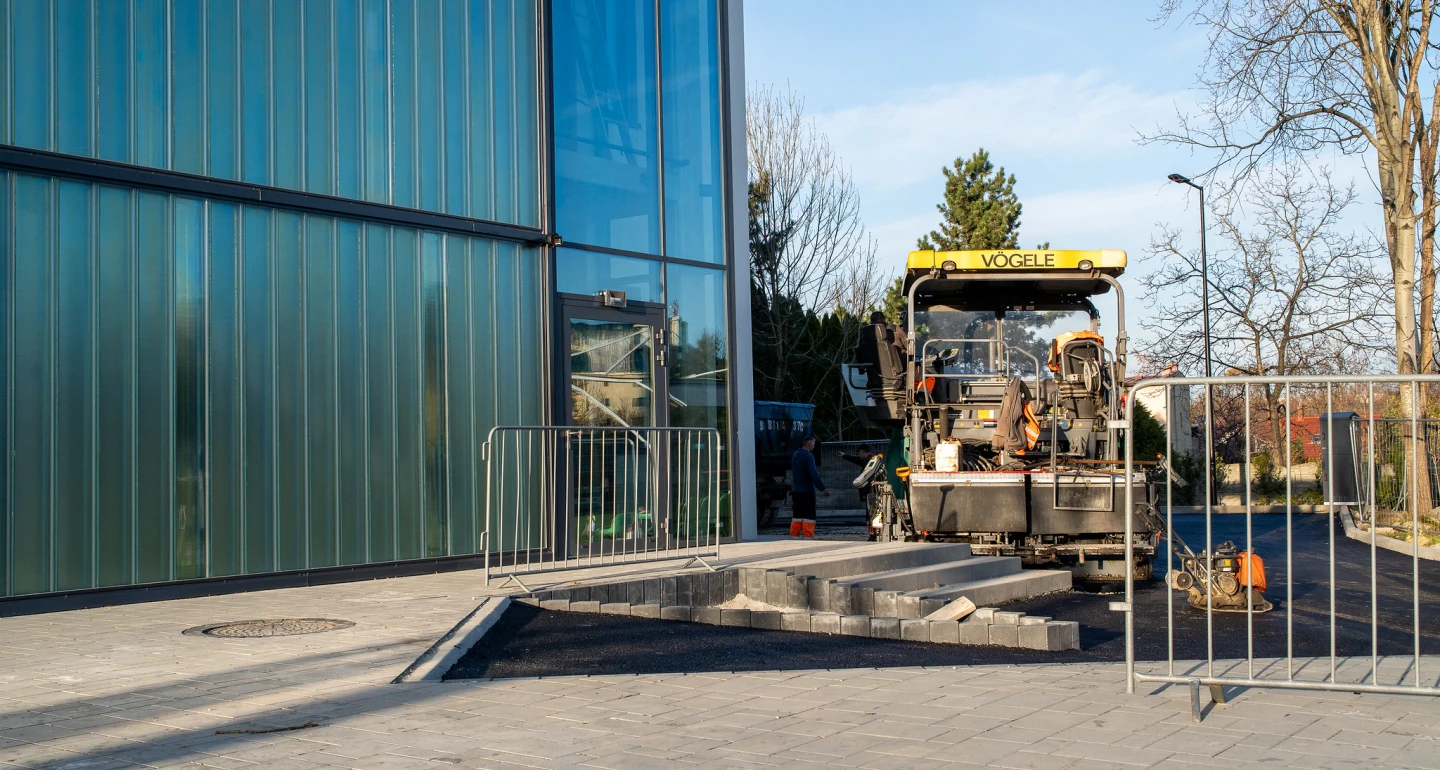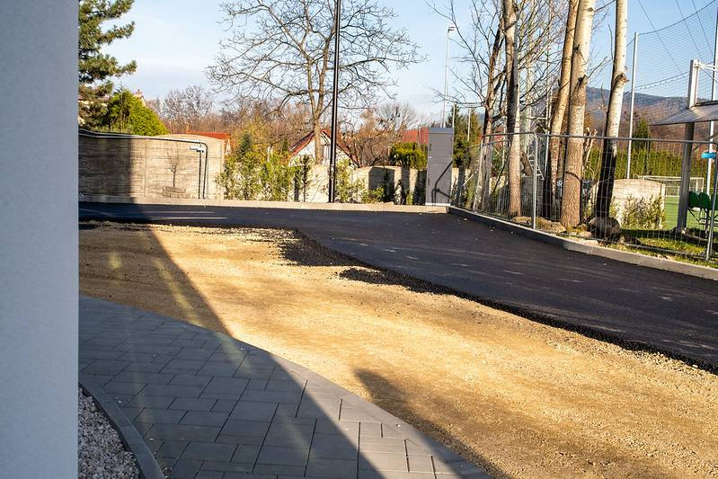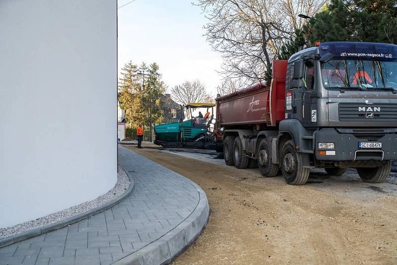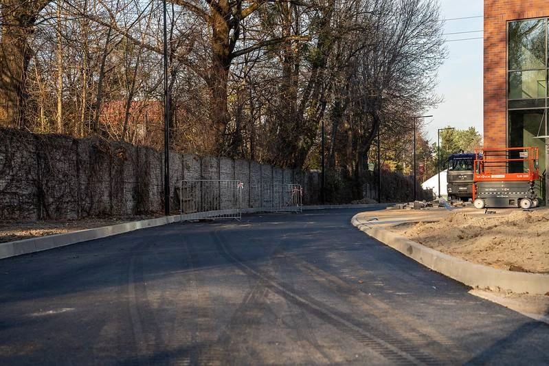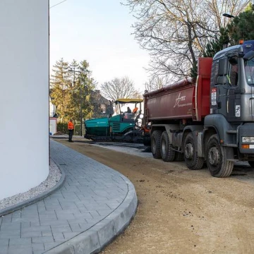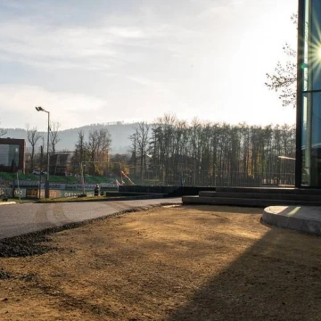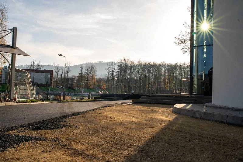 Nie tylko wewnątrz hali trwają prace. Zdecydowanie zmienia się również otoczenie wokół nowego obiektu. W zasadzie niemal w całości zakończono już prace brukarskie, rozpoczęto również proces asfaltowania dróg dojazdowych oraz parkingu pod halą.